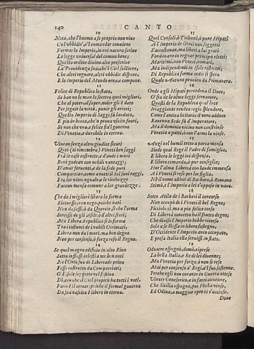 O' ſia de le alme leggi ſeruatore, Queſti de la Republica qual luce Irraggiante rendea regio ſplendore, Come l autica hi ſtoria il vero adduce Kauenna Sede fu d' 1mperatore, AMa il dominio vicino non conſtrinſe Venetia a patti, ò conl'armi la vinſe. 1