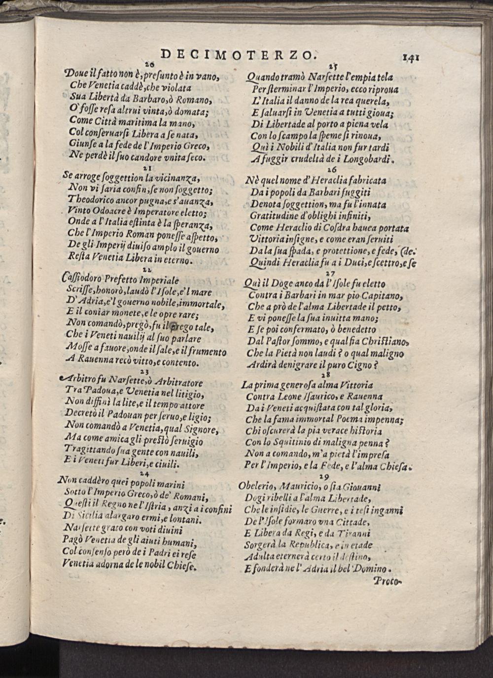 Ber ſterminarl Imperio, ecco riproua EItalia il danno de la rea querela, E ſaluarſi in UVenetia a tutti gioua; Di Libertade al porto a piena vela Con lo ſcampo la ſbeme 7 rinoua, Qul i Nobili d Italia non fur tardi A fuggir crudelta 25 i Longobardi. 1