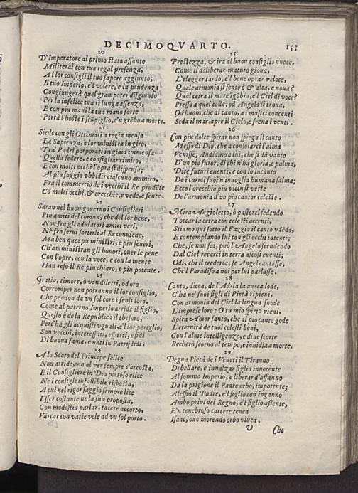 Toccar la cetra con cele fti accenti, Stiamo qud ſotto il Faggio il canto vlèdo, E contemplando lui con gli occhi intenti, Cbe, ſe non ſai, può l'e Tagelo ſcendendo Dal Ciel recarci in terra aſcoſt euenti; Odi, chi il crederia, ſe Angel cantaſſe, Che'l Paradiſo a ni pe, lui parlaſſe.