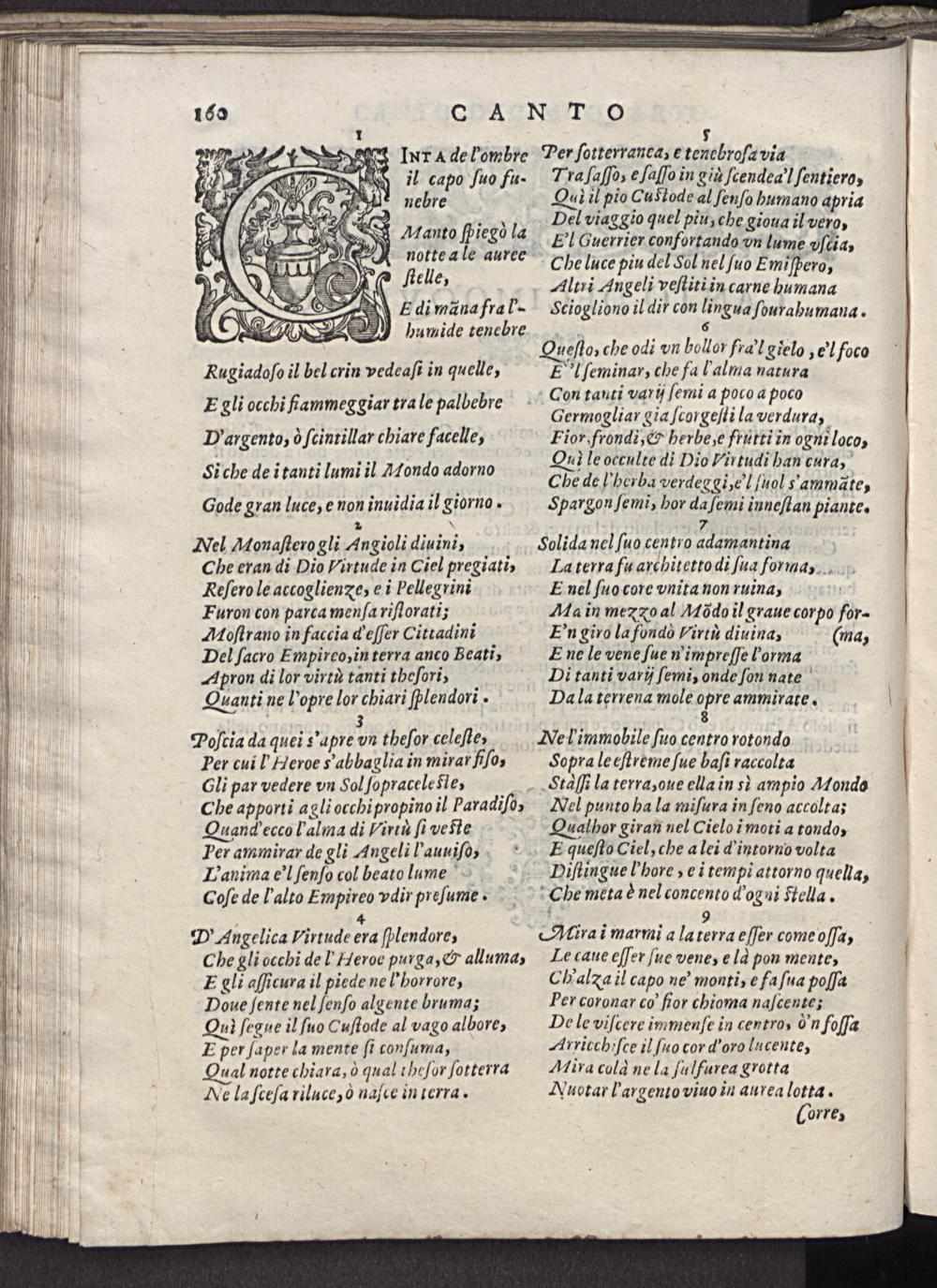 2 Der ſotterranca, e tenebroſa via Tra ſaſo, e ſaſſo in giu ſcendea' ſentiero, Qal il pio Custode al ſenſo humano apria Del viaggio quel piu, che gioua il vero, El Guerrier confortando vn lume vſtia, COhe luce piu del Sol nel ſuo E miſpero, Altii Angeli veſtiti in carne humana Sciogliono il dit con lingua ſourabumana. 6