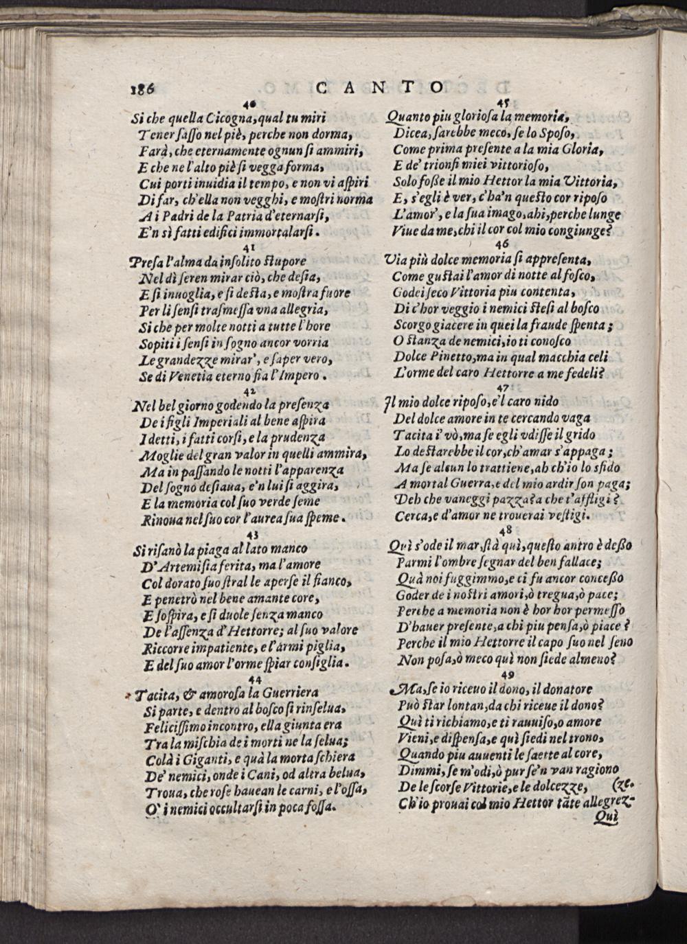 41 Preſalalma da inſolito flupore Nel di ſeren mirar ciò, che deſia, E ſi inuoglia, e ſi defta, e moſtra fuore Per li ſenſi traſmeſſa vna allegria, Si che per molte notti a tutte! hore Sopiti i ſenſi in ſogno ancor vorria Le grandezXe mirar', e ſaper vero, Se di Venetia eterno ſial Impero.