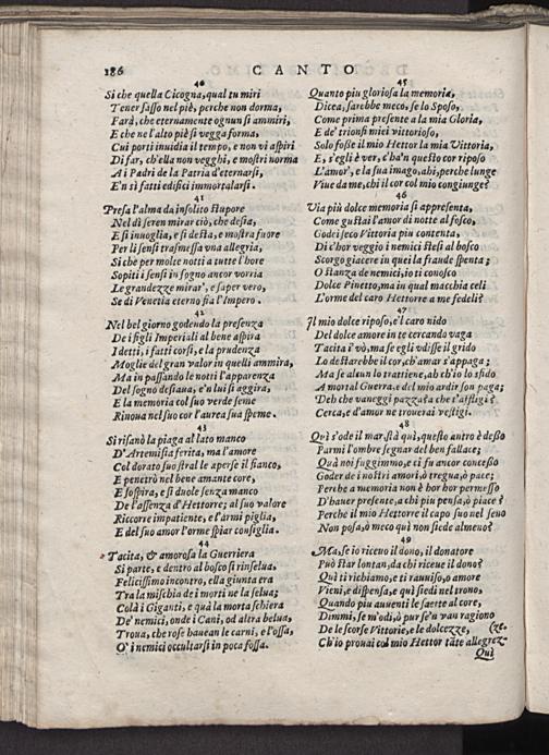 4³ Qui v'ode il mari ſid qud, queſto antro è deßßo Parmi lombre ſegnar del ben fallace; Qud noi fuggimmo, e ci fu ancor conceſeo Goder de i noftri amori, ò tregua,ò pace; Perehe a memoria non è hor hor permeſſo D'bauer preſente, a chi piu penſa,ò piace? Perche il mio Hettorre il capo ſuo uel ſeno Non poſa,ò meco qu non ſicde almeuo? 49 Ata⸗ ſe ĩo riceuo il dono, il donatore Può ftar lontan, da chi riceue il dono? Qud ti richiamo, e ti rauuiſo,o amore Vieni, e diſpenſa, e qul ſiedi nel trono⸗ Quando piu auuenti le ſaette al core, Dimmi, ſe m'odi, ò pur ſe'n yau ragiono De le ſcorſe Vittorie, e le dolcezxe, Ge.