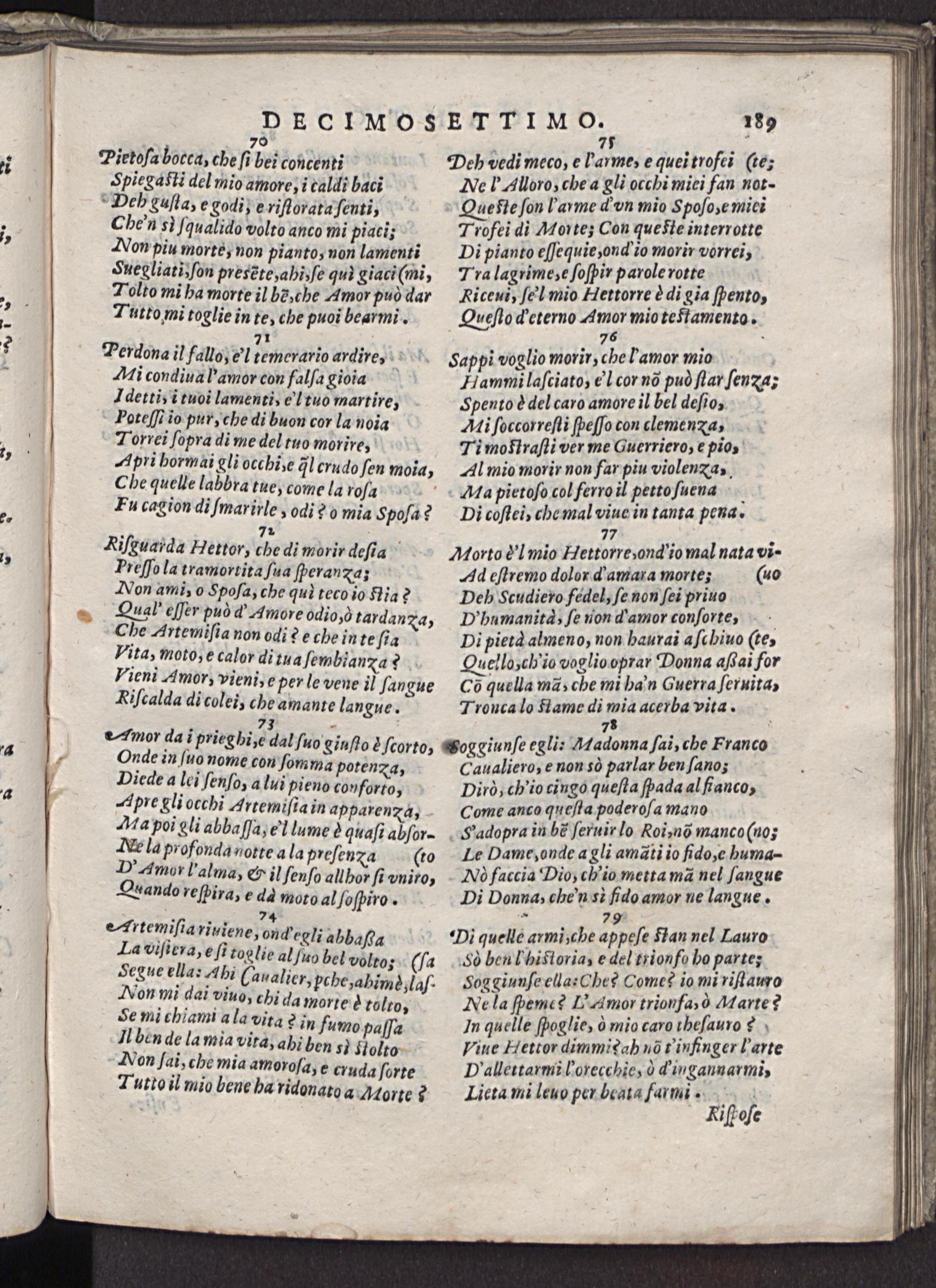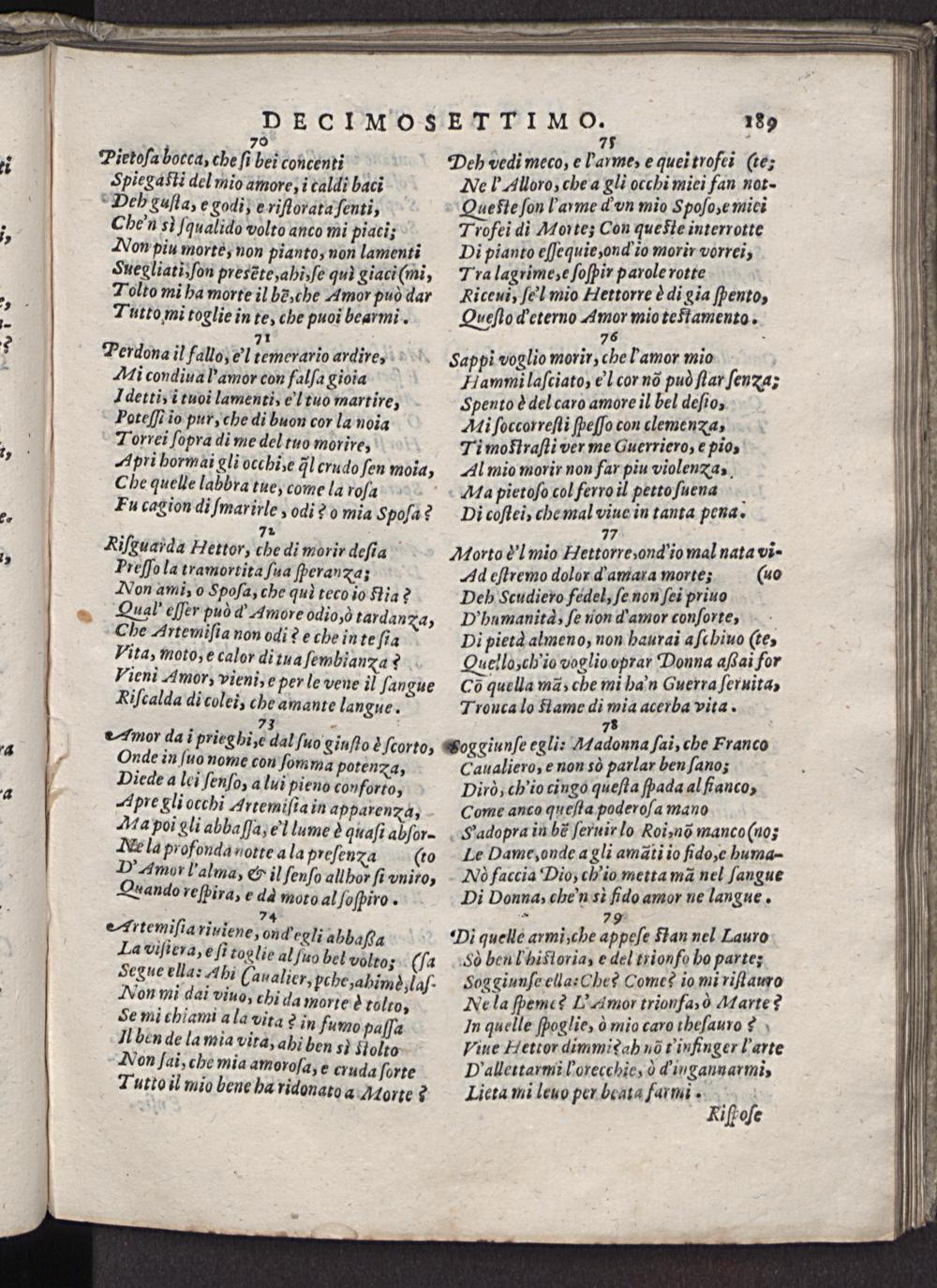 Riſcuarda Hettor, che di morir deſia Treſſo la tramorrita.ſua ſperanxa; Non ami, o Spoſa, che qul teco io Nia? Qual' eſſer può d' Amore odio,ò tardana Che Artemiſia non odi? e che inte ſia 3 Vita, moto, e calor di tua ſembianza? Tieni Amor, vieni, e per le vene i) ſangue Riſcalda di colei, che amante langue.