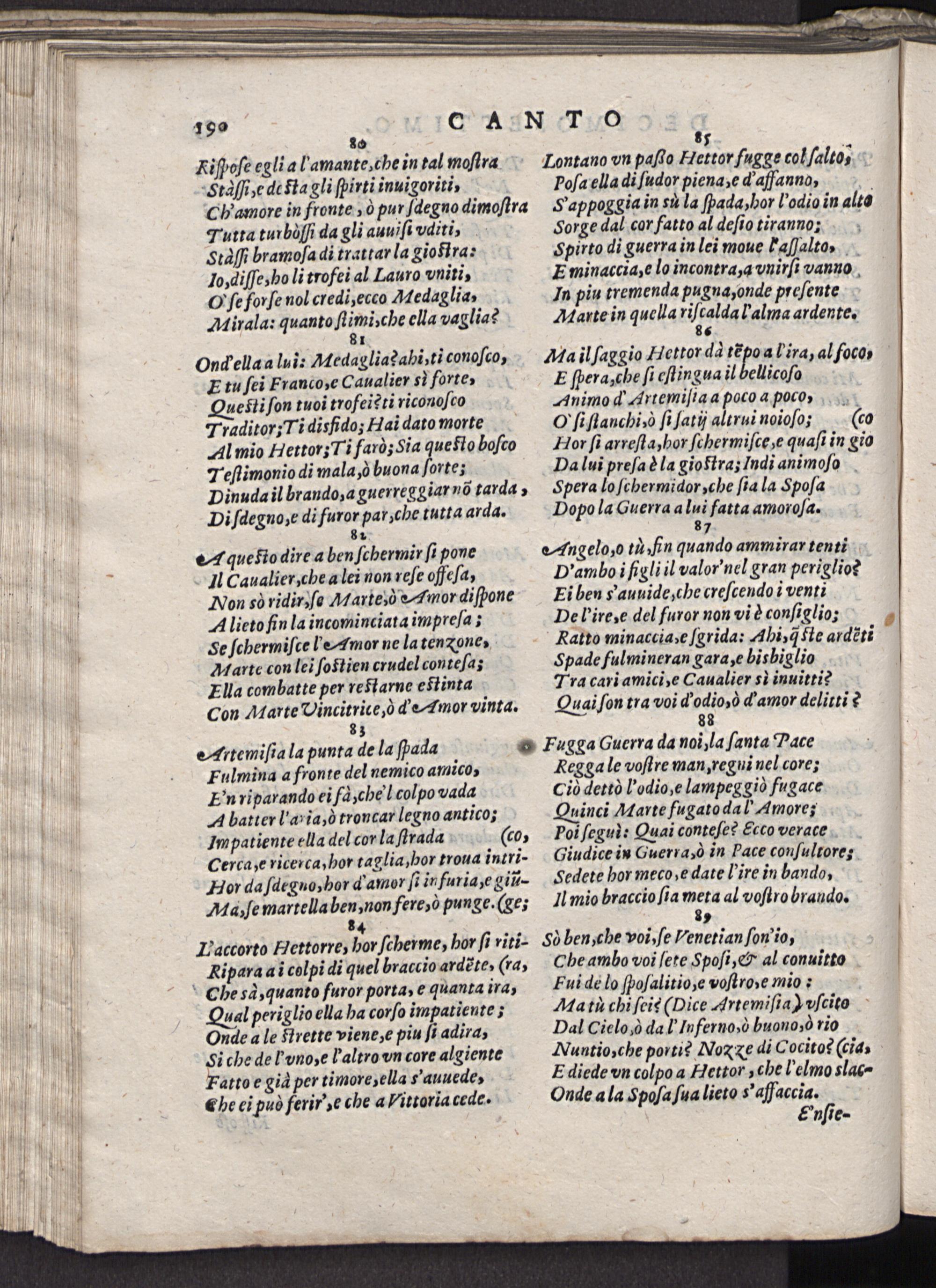 Ala il ſaggio Hettor dà tẽ᷑poa ira, al foco, E ſpera, che ſi eſtingua il bellicoſo Animo d' Artemiſia a poco a poco« O'ſi ſtanchi,ò ſi ſatij altrui noioſon(co Hor ſi arreſta, bor ſchermiſce, e quaſi in gio Da lui preſa la gioftras Indi animoſo Spera lo ſchermidor, che ſia la Spoſa Dopo la Guerra a lui fatta amoroſa.