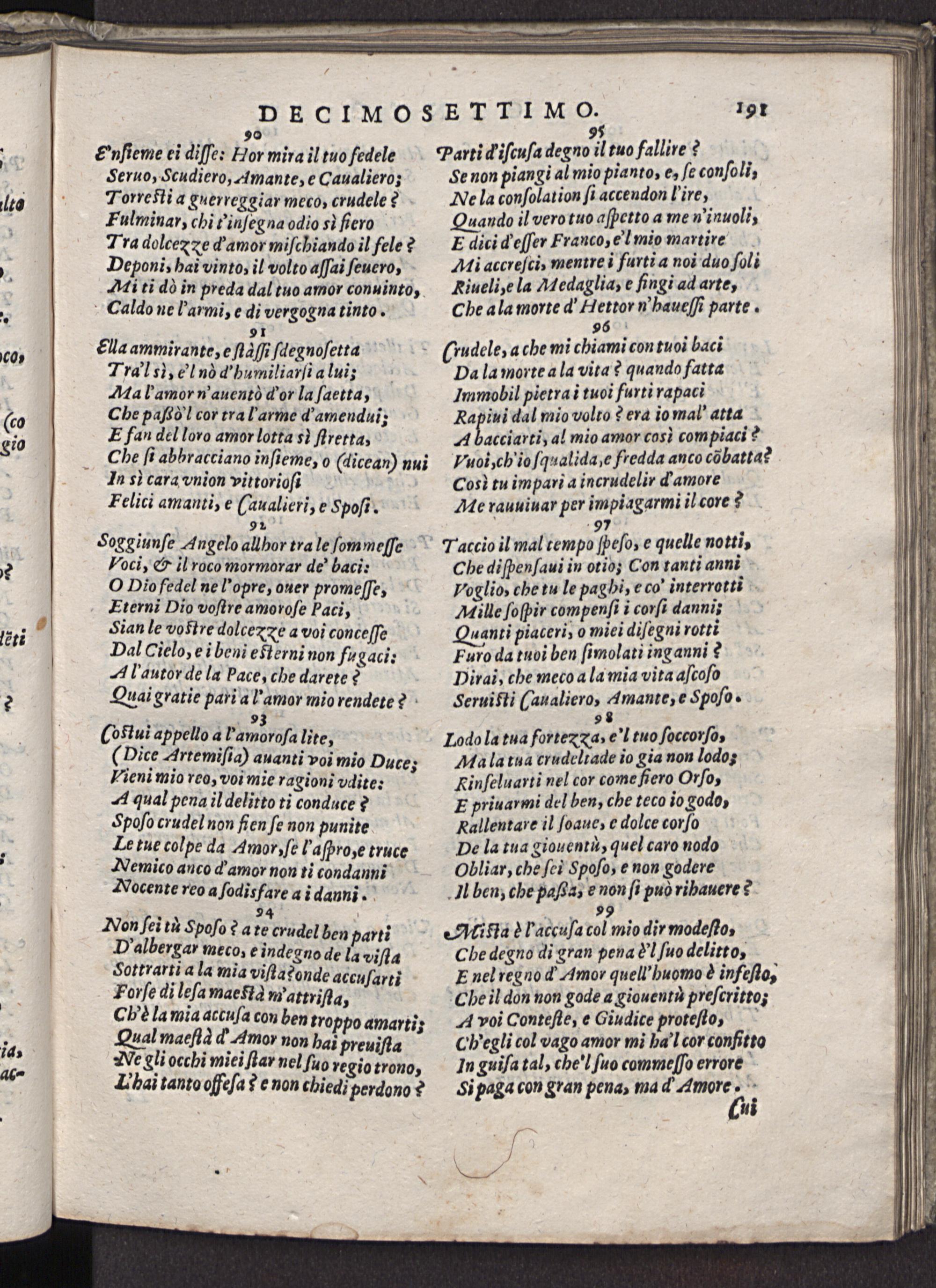 Se non piangi al mio pianto, e, ſe conſoli, Ne la conſolation ſi accendon! ire, Quando il vero tuo aſpetto a me n'inuoli, Edici d eſſer Franco, el mio martire Ai accreſci, mentre i furti a noi duo ſoli Riueli, e la Medaglia, e fingi ad arte, Che a la morte d Hettor n' haueſſi parte. 96