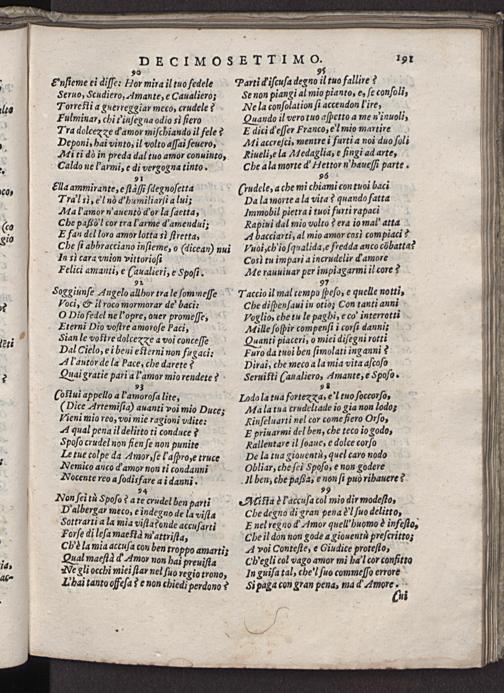 Enſieme ei diſſe: Hor mira il tuo fedele Seruo, Scudiero, Amante, e Caualiero; Zorrefti a guerreggiar meco, crudele? Fulminar, chi tinſegna odio s fiero Tra dolcexxe d'amor miſchiando il fele? Deponi, hai vinto, il volto aſſai ſeuero, Adi ti dò in preda dal tuo amor conuinto,