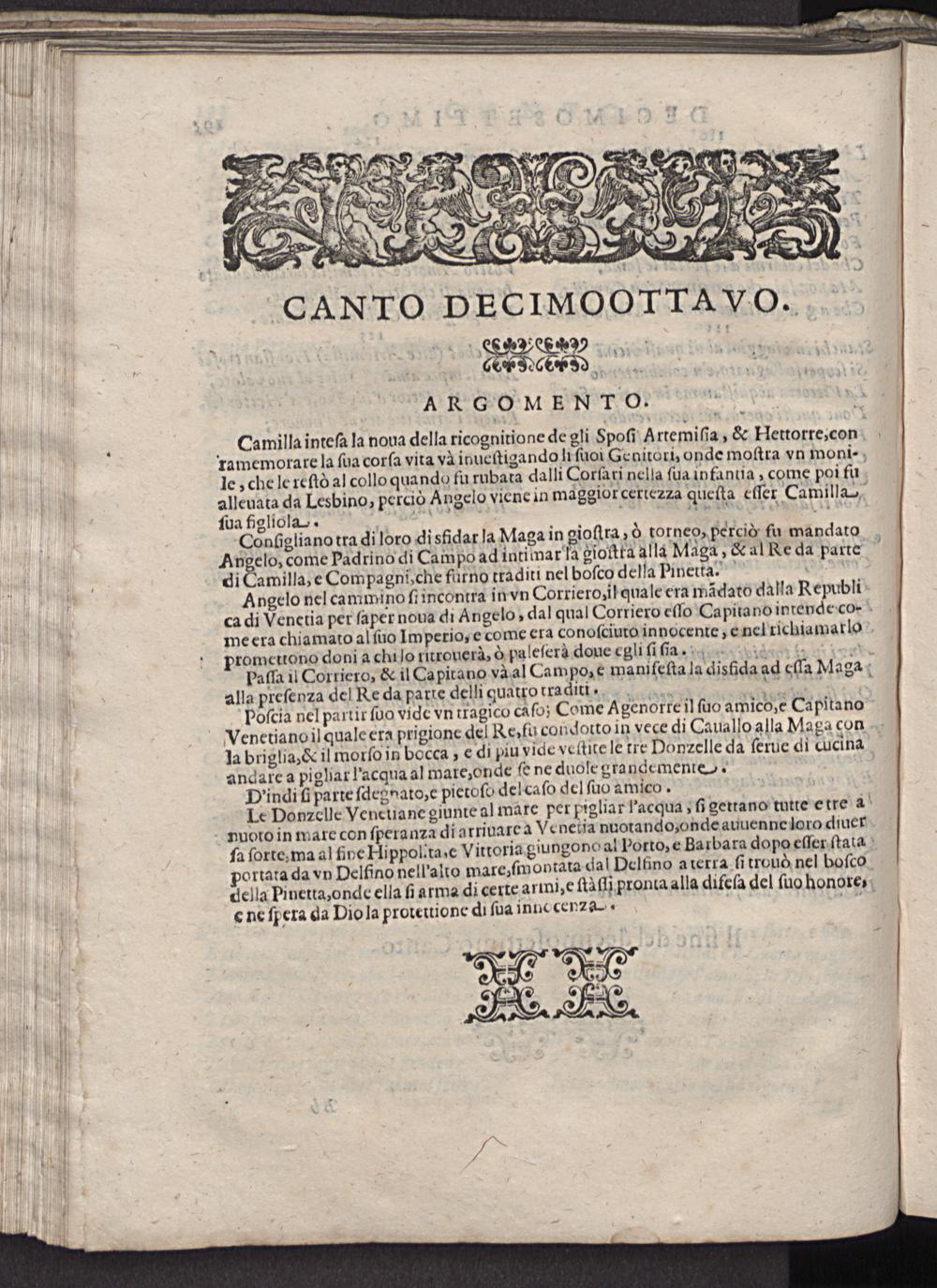 Le Donzelle Venctiane giunte al mare per pigliar Pacqua, ſi gettano tutte etre a nuoto in mare con ſperanza di arriuare a Venctia nuotando, onde auuenne loro diuer ſa ſorte, ma al fine Hippolita, e Vittoria giungono al Porto, e Barbara dopo eſſer ſtata portata da vn Delfino nell'alto mare, ſmmontata dal Delfino aterra ſi trouò nel boſco della Pinetta, onde ella ſi arma di certe armi, e ſtaàſſi pronta alla diſeſa del ſuo honore,