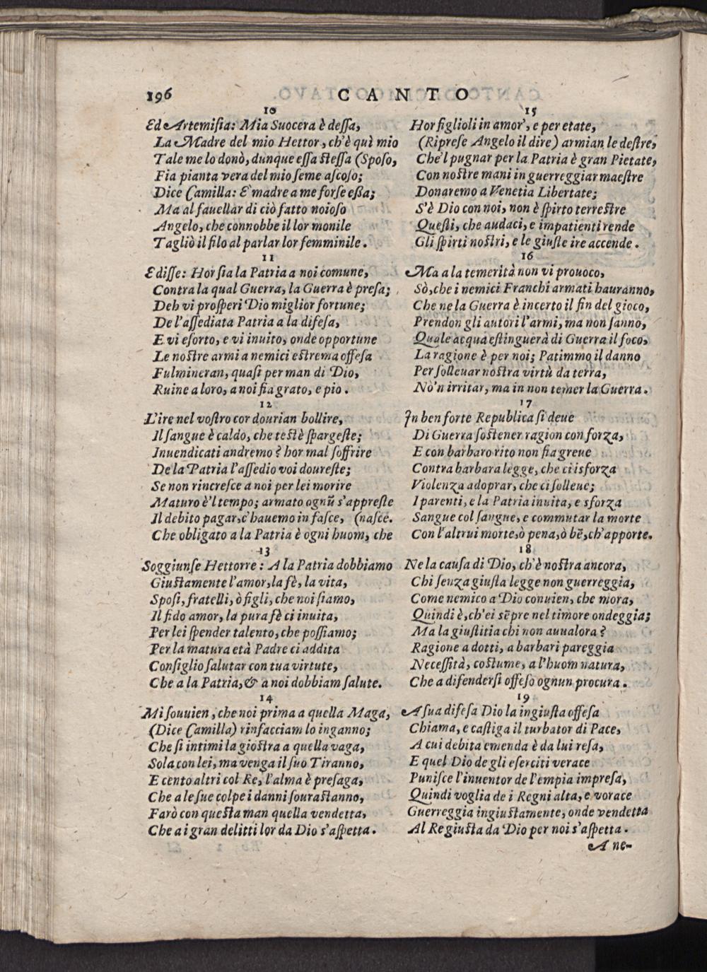 Soggiunſe Hettorre: Ala Patria dobbiamo Giuſtamentel'amor, la fe, la vita, Spoſi, fratelli, ofigli, che noi ſiamo, Il fido amor, la pura fo ci inuita, Per lei ſpender talento, che poſſiamo; Per la matura eta Padre ci addita Conſiglio ſalutar con tua virtute, Che a la Patrxia,& a noi dobbiam ſalute. 14—