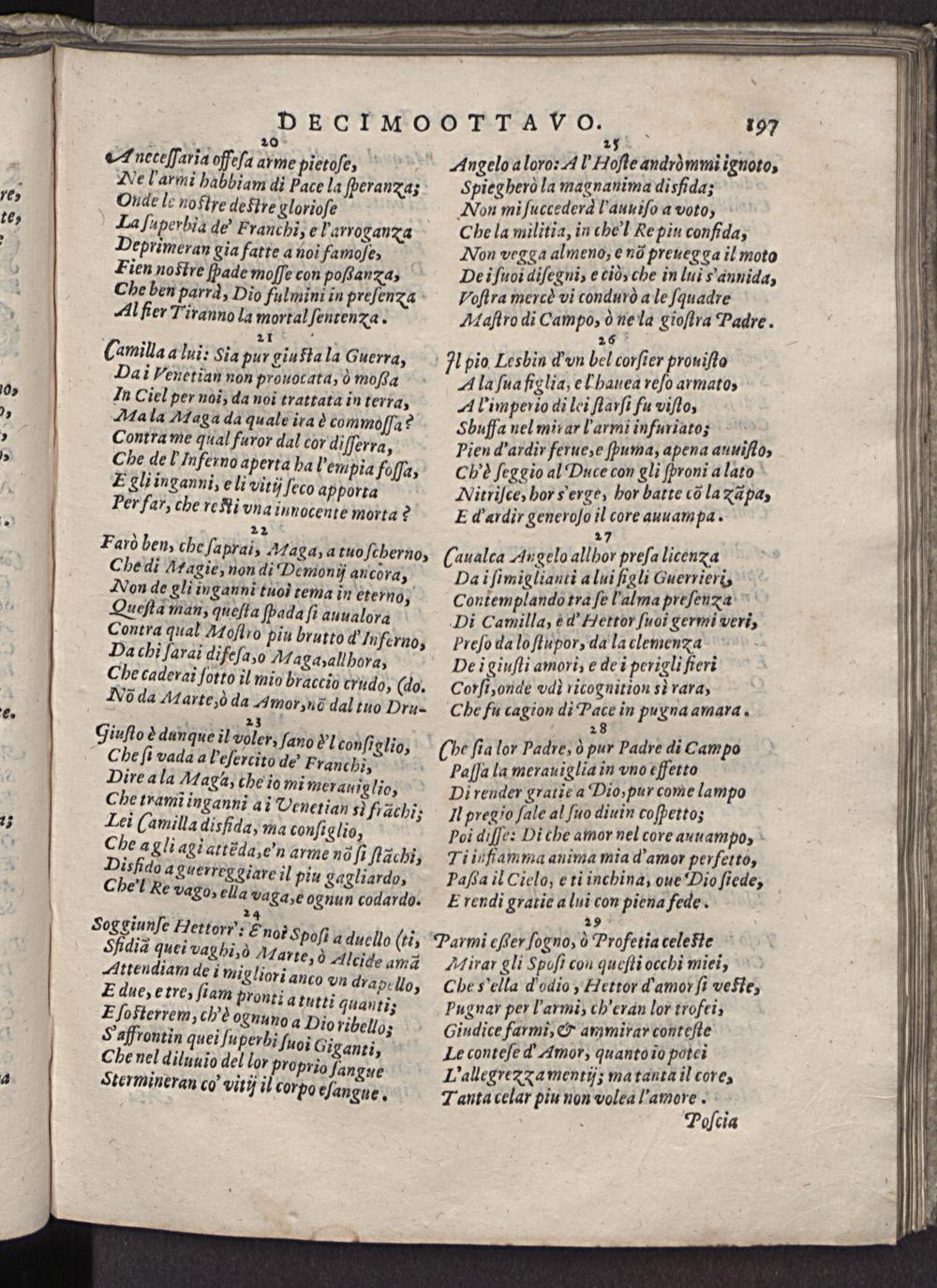 (aualca Augelo allhor preſa licenæa Da i ſimiglianti a lui figli Guerrieri, Contemplando tra ſel alma preſenæa Di Camilla, èd' Hettor ſuoi germi veri, Pre ſo da loſtupor, da la elemena De ĩ ginſti amori, e de i perigli fieri Corſt, onde vd' ricognition sà rara, Che fu cagion di T. in pugna amara.