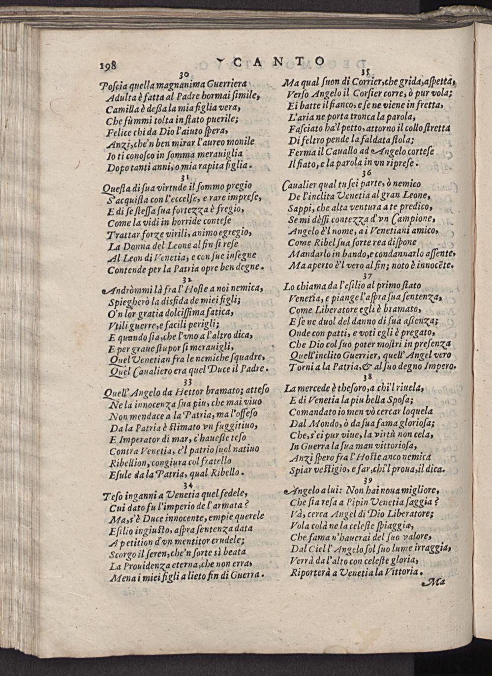 30 Poſcia quella magnanima Guerriera Adultaè fatta al Padre hormai ſimile, Camilla è deſia la mia figlia vera, Che fummi tolta in flato puerile; Felice chi da Diol aiuto ſpera, Anxi, che'n ben mirar laurco monile Jo ti conoſco in ſomma merauiglia Dopxo tanti anni, o mia rapita fglia- 31 Queſia di ſua virtude il ſommo pregio Facquiſta con!'eccelſe, e rare impreſe, E di ſe ſteſſa ſua fortexaè fregio, Come la vidi in horride conteſe Trattar forge virili, animo egregio, La Donna del Leone al fin ſi reſe Al Leon di Venetia, e con ſue inſegne Contende per la Patria opre ben degne.