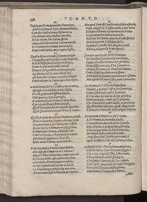 eAngelo a lui: Non hai noua migliore, Che ſia reſa a Pipin Venetia ſaggia? Vaà, cerca Angel di Dio Liberatore; Vola colà ne la celeſte ſpiaggia,. Che fama n'hauerai del ſuo valore, Dal Ciel!' Angelo ſol ſuo lume irraggia, Verrd dal'alto con celeſte gloria, Riporterà a Denetia la Tittoria.