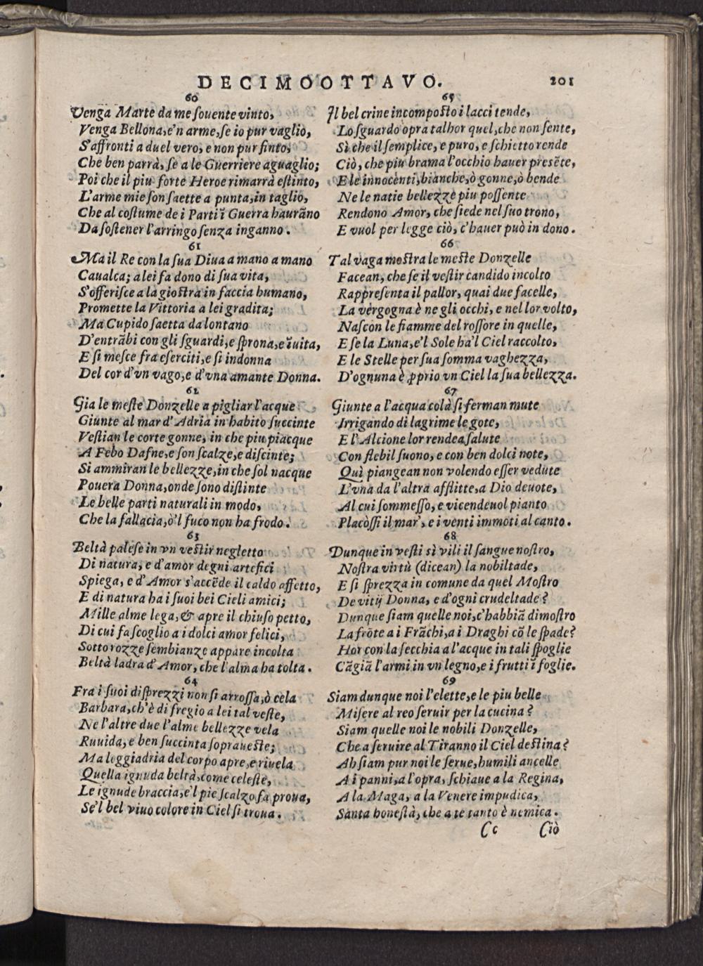 62 Gia le meſte Donzelle a pigliar acque Giunte al mard' Adria in habito ſuccinte V'eſtian le corte gonne, in che piu piacque A Pebo Dafne'e ſon ſcale,e diſcintes Si ammiran le bellez xe, in che ſol uacque Pouera Donna, onde ſono diſtinte Le belle parti naturali in modo, Che la fallacia, è'l fuco non ha frodo.
