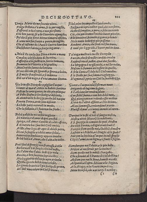 Siam dunque noi l elette,e le piu belle Atiſere al reo ſeruir per la cucina? Siam quelle noi le nobili Donxelle, Cbe a ſeruire al Tiranno il Ciel deftina? Ab ſiam pur noi le ſerue, humili ancelle Ai panni, a lopra, ſchiaue a la Regina, Ala Ataga, a la Venere impudica, Sauta boucſtd, cbe ate tanto è uemica.