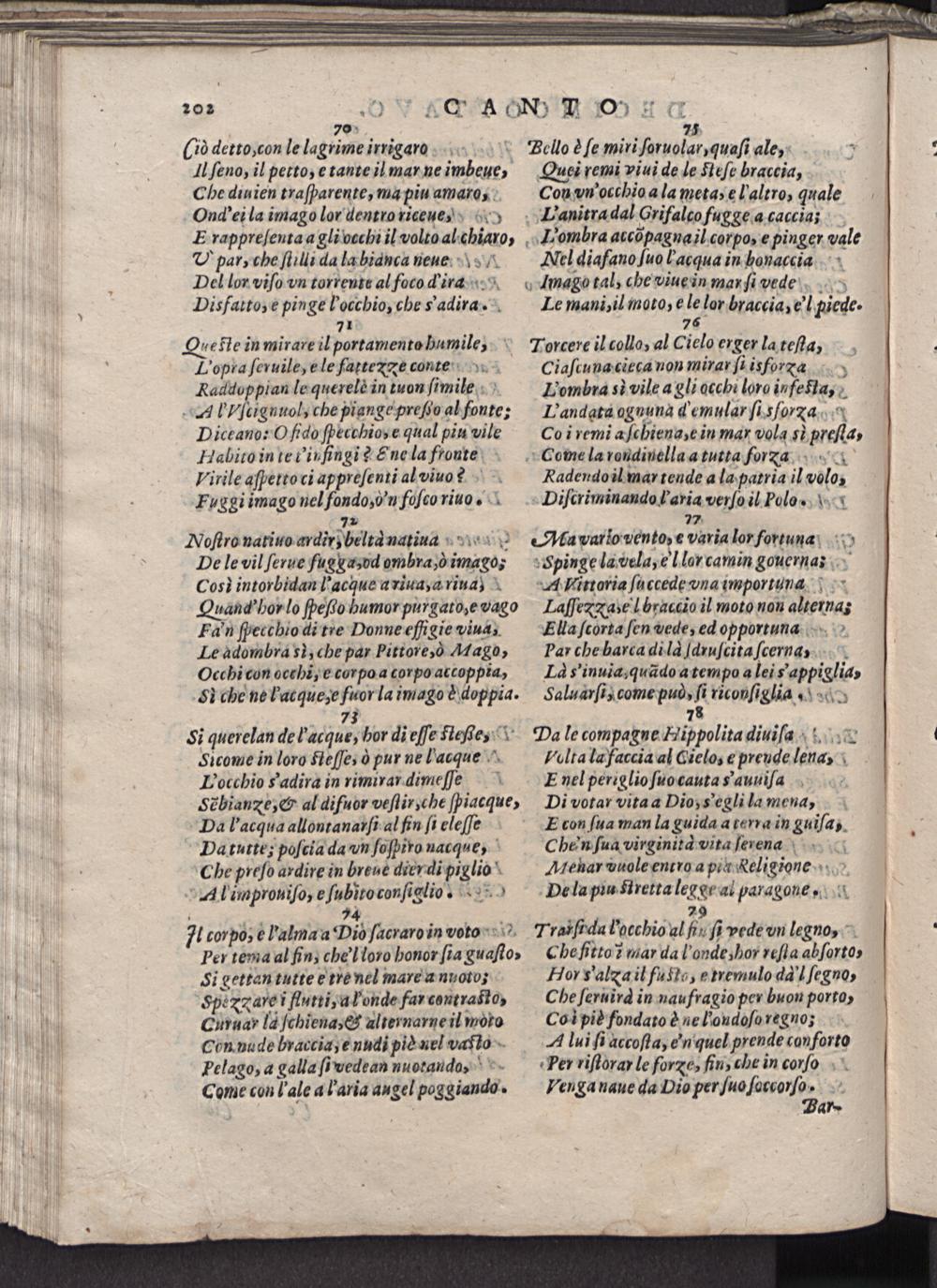 70 (iò detto, con le lagrime irrigaro Il ſeno, il petto, e tante il mar ne imbeue, Che diuien traſparente, ma piu amaro, Onad'ei la imago lor dentro riceue, E rappreſeuta a gli vechi il volto al chiaro, V par, che ſtilli da la bianca neueo, Del lor viſo vn torrente al foco dira Disfauto, e pinge l'occhio, che Sadira. 1