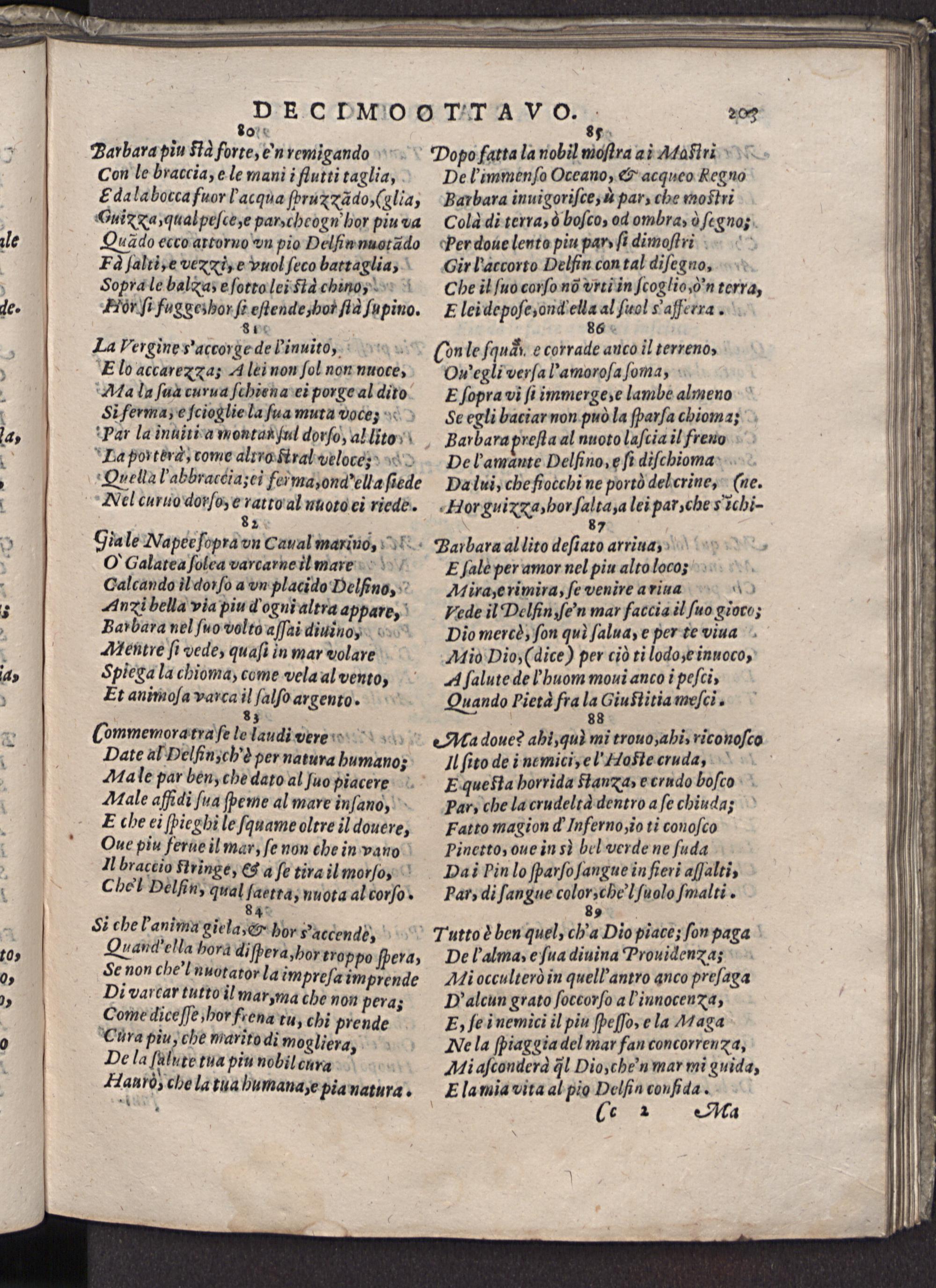 Barbara al lito deſiato arrinax E ſale per amor nel piu alto loco Mira‚e rimira, ſe venire a riua A0 Vede il Delhin ſe'n mar faccia il ſuo giore; Dio mercò, ſon qul ſalua, e per te viua AMio Dio,(dice) per ciò ti lodo, e innoco, A ſalute del' huom moui anco i peſci, Quando Pietà fra ſe Giusz ais meſci.