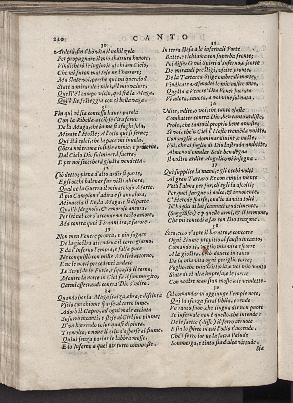 34 — Quando bor la Maga ſcalza, ebra, e diſcinta Vſcio con chiome ſpaxſe al tetro lume, Adorò il Capro, ad ogni male accinta Suſurrò incanti, e fleſe al Giel ſue piume; D'on horrendo color quaſi dipinta: Tre volte, e noue il crin saſperſe al hume, Sein ſena parlar le labbra molſe, Elo Inferno a quel dir tutto commoſße ·