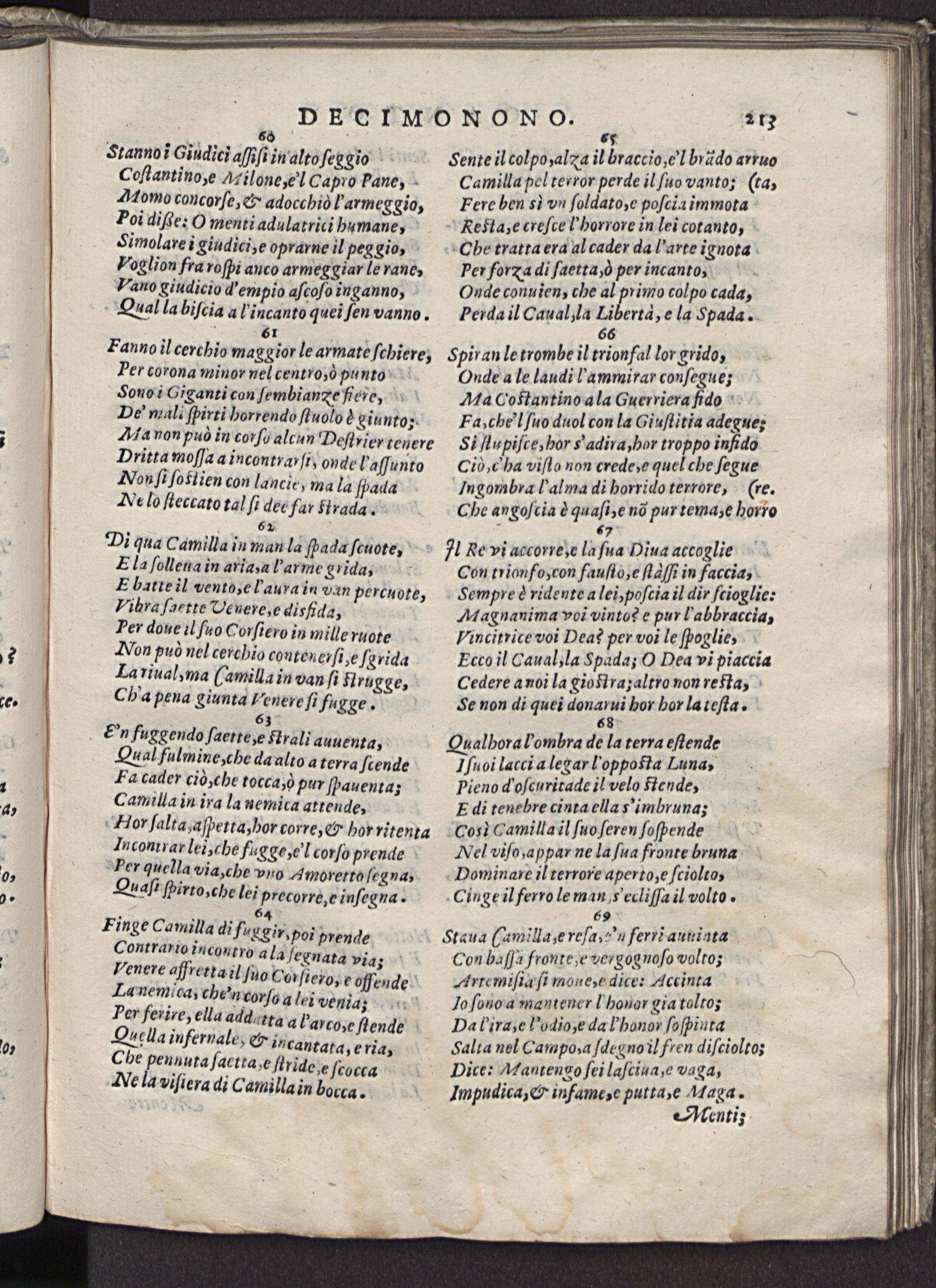 Con haſſa fronte, e vergognoſo volto; I Arte miſia ſi mone,e dice: Accinta— Io ſonoa mantener! houor gia tolto; Dat'ira, e!'οdio, e da honor ſoſpiuta Salta nel Campo, a ſdegno il fren diſciolto: Dice: Mantengo ſei laſciua, e vaga, Impudica,& infame, e putta,e Maga. Aentiz;