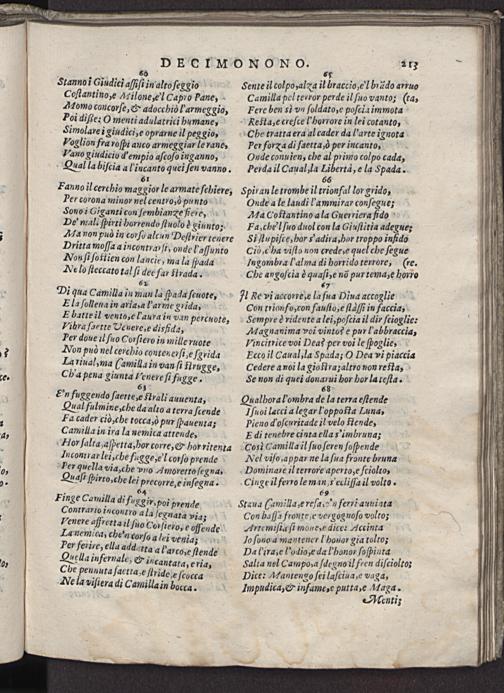 Con trionfo, con fauſio, e ſlaſſi in faccia, Sempre è ridente a lei, poſcia il dir ſcioglie: AMagnanima voi vintoꝰ e pur l'abbraccia, Vincitrice voi Deas per voi le ſpoglie, Ecco il Caual, la Spada; O Dea vi piaccia Cedere a noi la gioftra; altro non reſta, Se non di quei donarui hor hor la teſta. 68