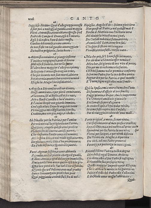 47 Qul la Spoſa, e mia nuora ha moſtrolvno Di fattura,e d'efigie al tuo ſimiles Fuggi pianto,e Stapor, duolo importuno Tu UDoneta Gamilla in giouenile Etaà ſamoſa ſuperi d'ognuno, In creder lopre,el tno valor virile, Se a me foſti rapita dai Corſali, Pur ti riueggio in colmo de tuoi mali. 4⁸G Fatta prigion', e meco, ſe non vinta, Con falſo incanto al meu preſa, e tradita; Spera ĩ Dio; ma a pr noftro al arme accin Spenderai per la Patria la tua vita;(ia Viurai per ſangue, e per virtù diſtinta Da Venere, da Maghe,e dipartita Da vitij, col tuo Padre prouerai FortexXa,e patiena in tutti i guai.