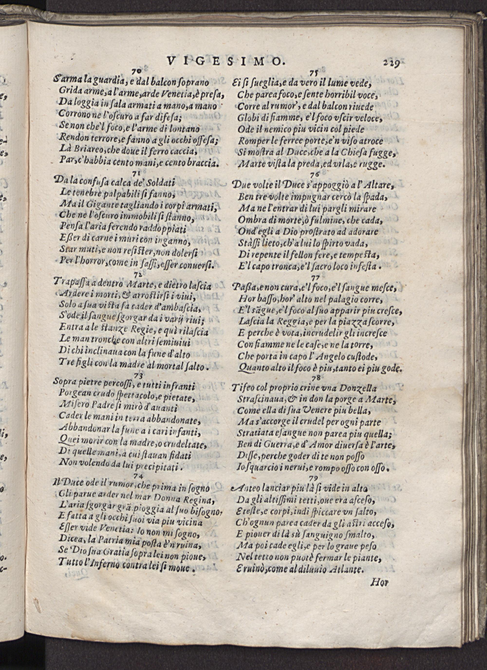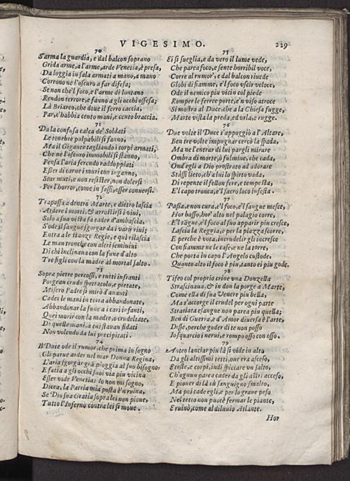 77. ci ſi ſueglia,e da vero il lume vede, Che parea foco,e ſente horribil voce, Corre al rumor', e dal balcon riuede Globi di fiamme, e'l foco vſcir veloce, Ode il nemico piu vicin col piede Romper le ferree porte, e'n viſo atroce