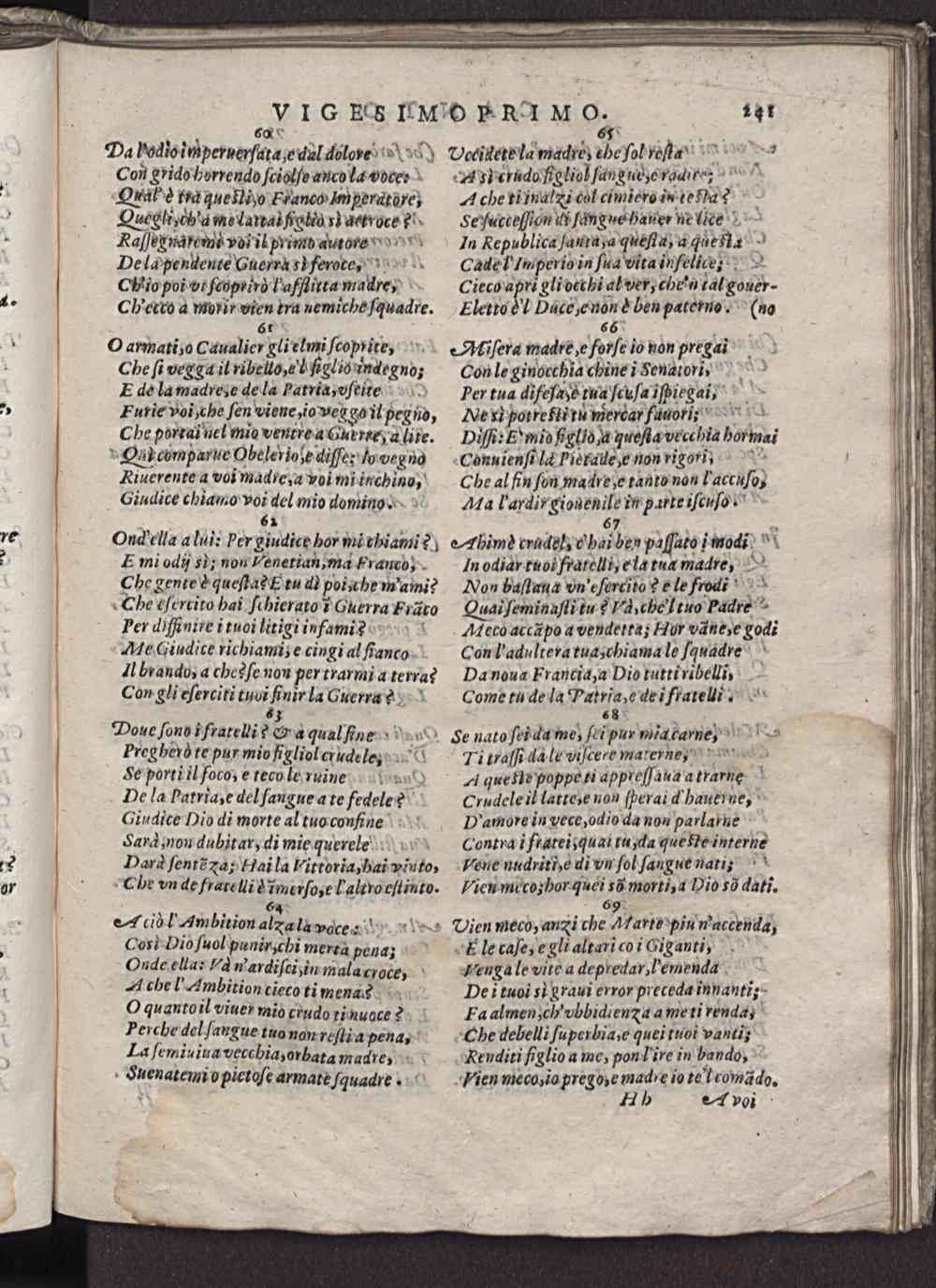 Ti traſſi da le viſcete materney. A quefle poppe ti appteſſaua atrarne Crudele il latte,e nou ſherai d hauerne, D'amore in vece, odio da non parlarhe Contra i frateisquai tu, da que te interue Vaue nudriti, e di vn ſol ſangue nati; Vien mecos hor quei sã morti, a Dio sô dati. 69. Dien meco, anæi che Marte pin n'accenda, le caſe, e gli altari coi Giganti, Veuga le vite a depredar,lemenda De i tuoi si graui error preceda innanti; Fa almen, ch' vbbidiena a me ti renda, Ohe debelli ſuperbia, e quei tuoi vanti; Reuditi figlio a me, ponl ire in bando, Vien meco, io prego,e mad'e io tel comãdo. H 5 A voi