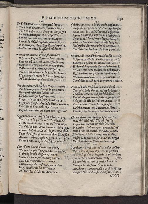 105 (ol dir ssauana, e la Fama in paſſando Acquiſta fora al ver l'odio saggiunge; Doue mori la Spoſaꝛil come, eòl quando Pipino ha inteſo,e enere vi giuuge; i Quando ei ſi leua forte a lex parlandoꝝ Ahi voi fate lamica, e pur da langen Nal voſtro Kegno ci vien uoua vera,“ Che ſiate voi barbara, bellas e fiera. 106 mmota ſidtteʒe d'vn cruccioſo niſo unò) Si ſereua, e riſpoſe:&chi vi porta u Da noua Frauctia s iufelice auuiſo? Eobhe nel Regno miot audida è morta f. Ch'a lhuom dita tramontid gid deciſoz E, ſe barbara legge, bor mi couforta, Che harbara ò naturaꝭ e reaconſorte Con deſtinar, chi vine, im grembo a morte.