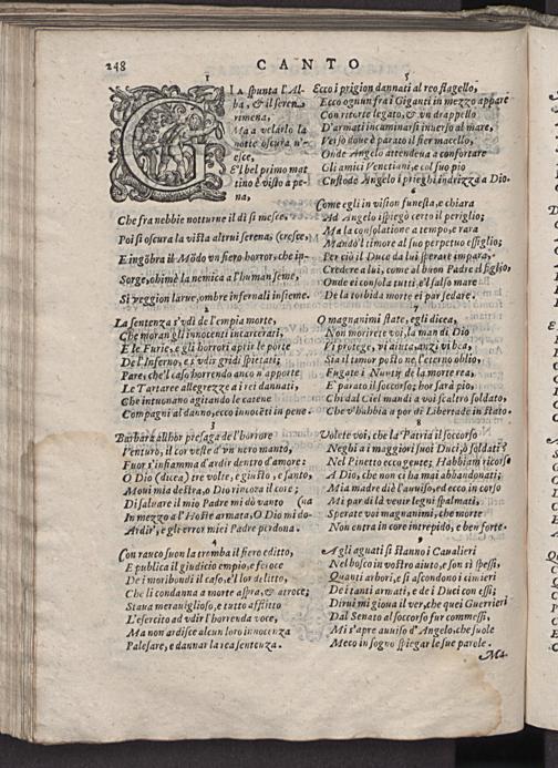 Q magnanimi ſiate, egli dicea, Non morirete voi, la man di Dio Vi protege, vi aiuta-au vibea, SFia il zmor poflo nel'eterno oblio, Fngate i Nuutij de la morte rea, E parato il ſoccorſos hor ſard pio-