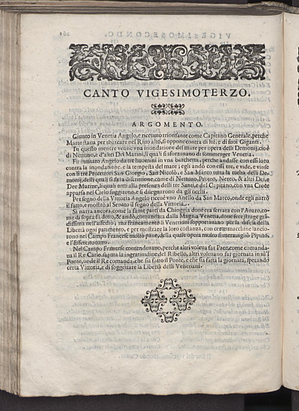 Giunto in Venetia Angelo, e riceuuto trionfante come Capitano Genetale, perche Marte ſtaua per sbarcatè nel Riuo alto, ſi oppone contra di luii, e di ſuoi Giganti. In queſto mentre venne vna inondatione del mare per opera delli Demonij, cioò