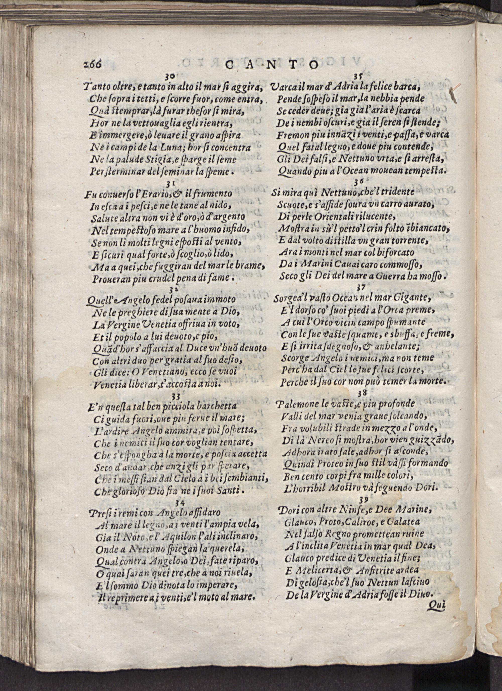 E'n queſta tal ben piĩcciola harchetta Ci guida fuori, one piu ferne il mare; P'ardire Angelo ammira, e poi ſoſbetta, COhe i nemici il ſuo cor voglian tentare, Che s'epongha a la morte, e poſcia accetta Seco d' andar, che ani gli par ſperare, Che ĩ meſſi ſian dal Cielo a i bei ſembianti, Cht glorioſοo Dio fia ne i ſuoi Santi.