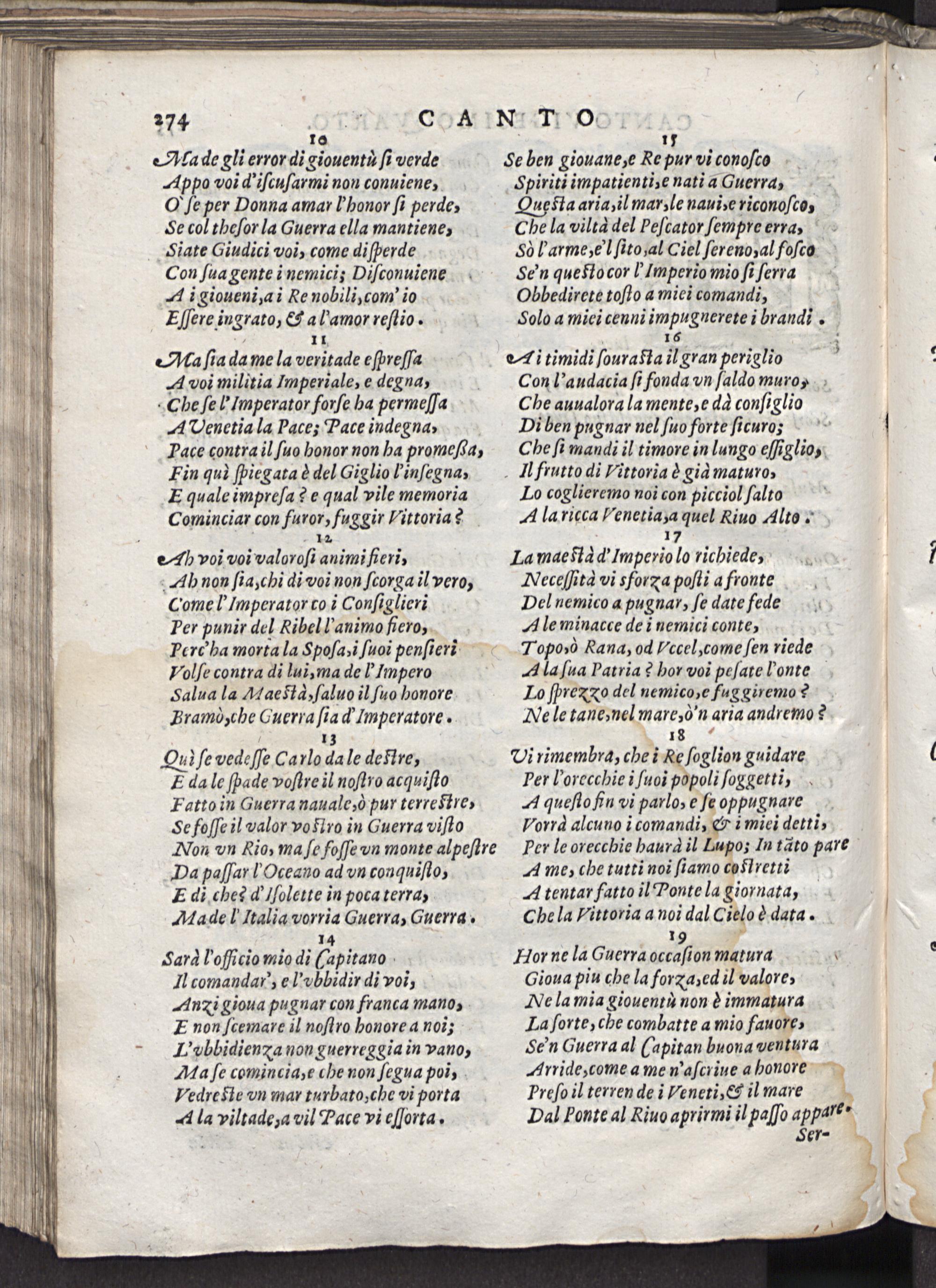Sard l'ofücio mio di(apitano Il comandar', el'vbbidir di voi, Anzi gioua pugnar con franca mano, E non ſcemare il noſtro honore a noi; L'vbbidienxa non guerreggia in vano, Ma ſe comincia, e che non ſegua poi, Vedre ſte vn mar turbato, che vi porta A la viltadea vil Pace vi eſſorta.