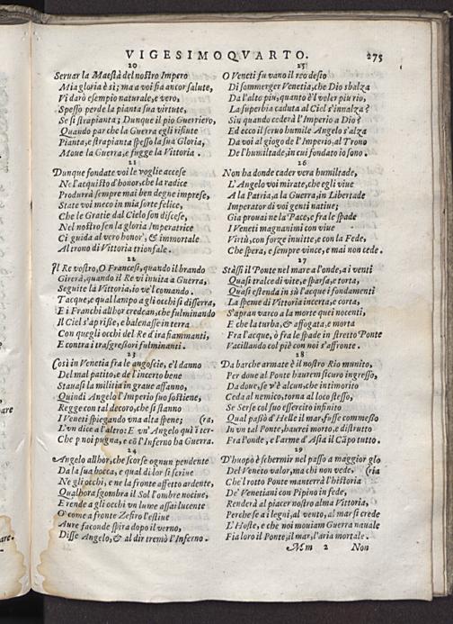 7 O Veneti fu vano il reo deſio Di ſommerger Venetia,che Dio sbalæa Da l'alto pin, quanto ꝰ' voler piu rio, La ſuperbia caduta al Ciel o'innala? Sin quando cederd! Imperio a Dio? Ed ecco il ſeruo humile Angelo Sala Da voi al giogo del' Imperio al Trono De l'humiltade, in cui fondato io ſono. 26 Non ha donde cader vera humiltade, LU'Angelo voi mirate, che egli viue A la Patria, a la Guerra, in Libertade Imperator di voi genti natiue; Gia prouai ne la Pace, e fra le ſpade IVeneti magnanimi con viue Virtu, con forge inuitte, e con la Fede, Che ſpera, e ſempre vince, e mai non cede. 2