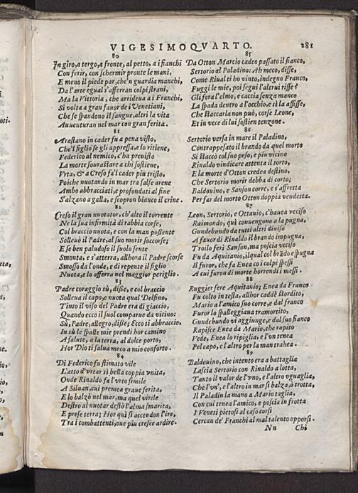 Onde Rinaldo fa Pvrto Mat Aæ˖ Siluan, cui premea graue ferita, E lo balzò nel mar, ma quel virile Deſtro al nuotar deſtò Palma ſmarita, E preſe terra; Hor qui ſi accendon l'ire, Tra ĩ combattenti,oue piu creſce ardire.