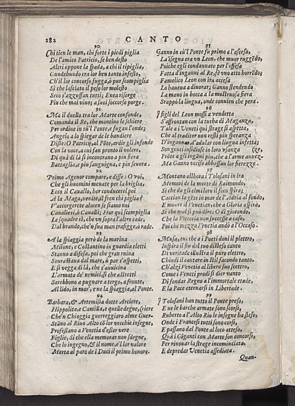 93 9 eAla ſpiaggia però de la marina Muſa tus che a ĩ Poeti doni il plettro Milone, e Coſtantino in guardia eletti Inſpira il ſin del tuo diſteſo canto Stanno a difeſa, poi che gran ruina Di veritade illutra il puro elettro, Soura ſtaua dal mare, u par Saſpetti, Cbhiudi il cantare in stil facondo tanto, E ſi vegga di ld, che Sauuicina Ch'alxi Venetia al libero ſuo ſcettro, Larmata de nemici, ſi che astretti Come: Veneti prodi ſi dier vanto Sarebbono a pugnare a tergo, a fronte, Di fondar Regno al immortale etade, Al lido, in mar,, e ne la ſpiaggia, al Ponte. Ela Pace eternarſi in Libertade.