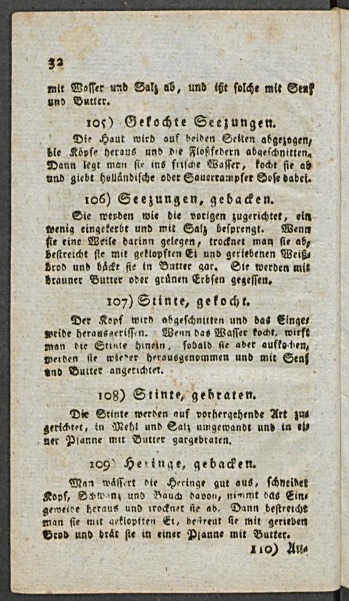 . Die Haut wird auf beiden Seiten abgezogen, bie Köpfe heraus und die Floßfedern abgeſchnitten⸗ Dann legt man ſie ins friſche Waſſer, kocht ſie ab und giebt hollaͤndiſche oder Sauerrampfer Soſe dabei.