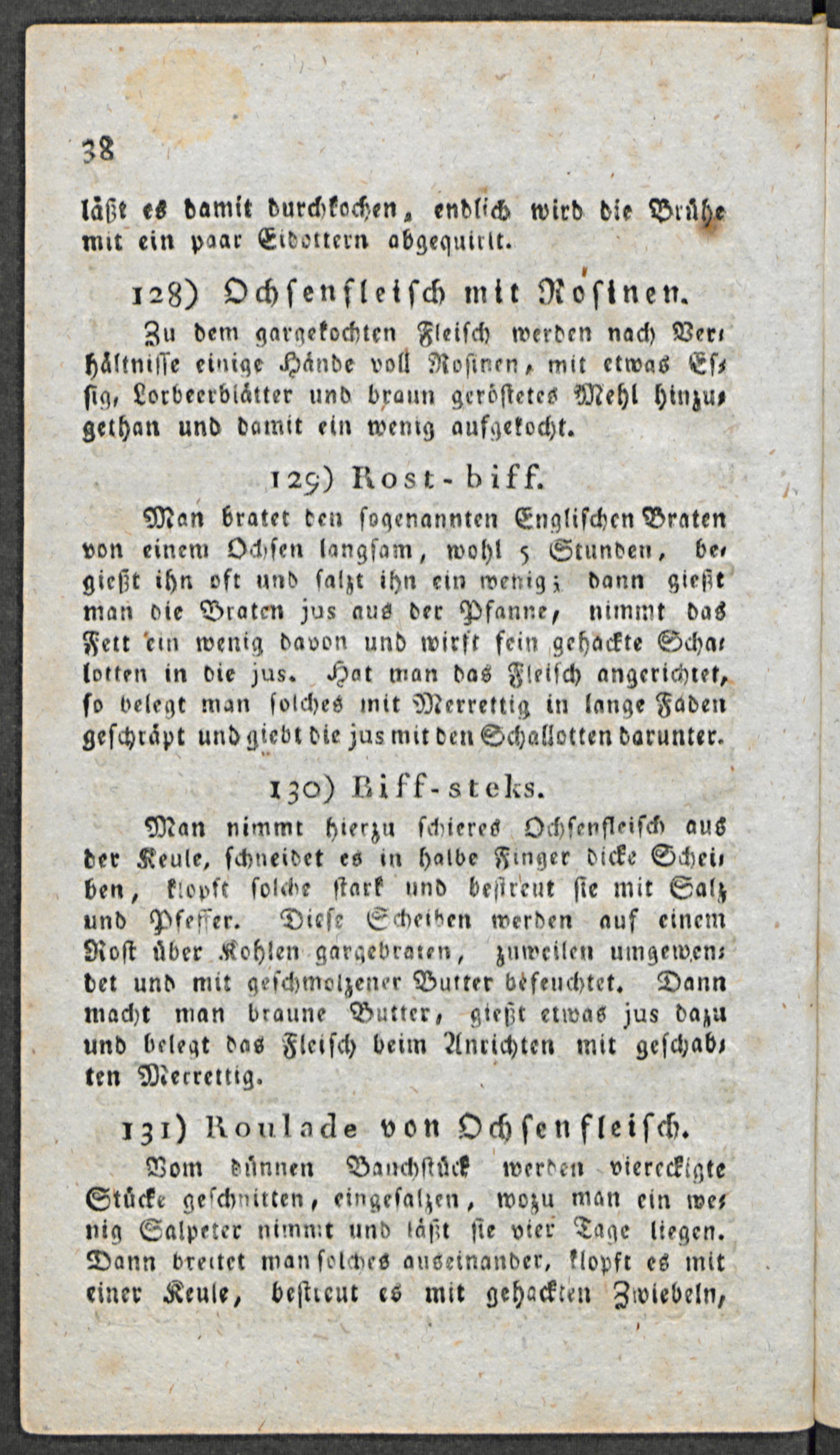 1 128) Ochſenfleiſch mit Roſinen. Zu dem gargekochten Fleiſch werden nach Ver⸗ haͤltniſſe einige Haͤnde voll Roſinen, mit etwas Eſ⸗ ſig, Lorbeerblaͤtter und braun geroͤſtetes Mehl hinzu⸗ gethan und damit ein wenig aufgekocht.
