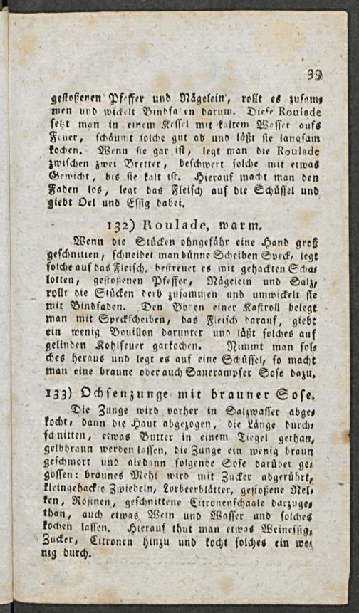Wenn die Stuͤcken ohngefaͤhr eine Hand groß geſchnitien, ſchneidet man duͤnne Scheiben Speck, legt ſolche auf das Fleiſch, beſtreuet es mit gehackten Scha⸗ lotten, geſtoßenen Pfeffer, Naͤgelein und Satz, rollt die Stuͤcken derb zuſammen und umwickelt ſle mit Bindfaden. Den Borden einer Kaſtroll belegt man mit Speckſcheiben, das Fleiſch darauf, giebt ein wenig Bouillon darunter und laͤßt ſolches auf gelinden Kohlfeuer garkochen. Nummt man ſol⸗ ches heraus und legt es auf eine Schüſſel, ſo macht man eine braune oder auch Sauerampfer Soſe dazu.