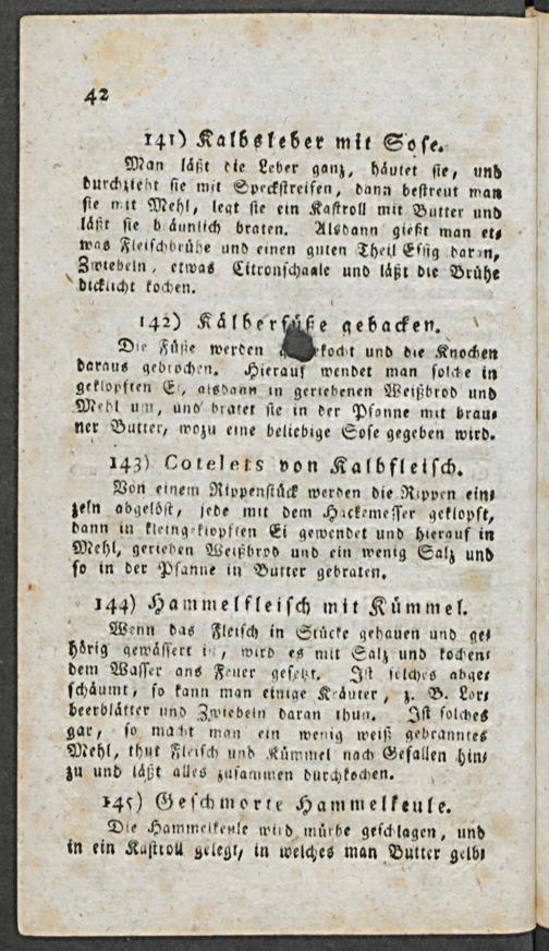 Die Fuͤßte werden kocht und die Knochen daraus gebrochen. Hierauf wendet man ſolche in geklopften Et, atsdann in gertebenen Weißbrod und Mehl um, and bratet ſie in der Pfonne mit brau⸗ ner Butter, wozu eine beliebige Soſe gegeben wird.