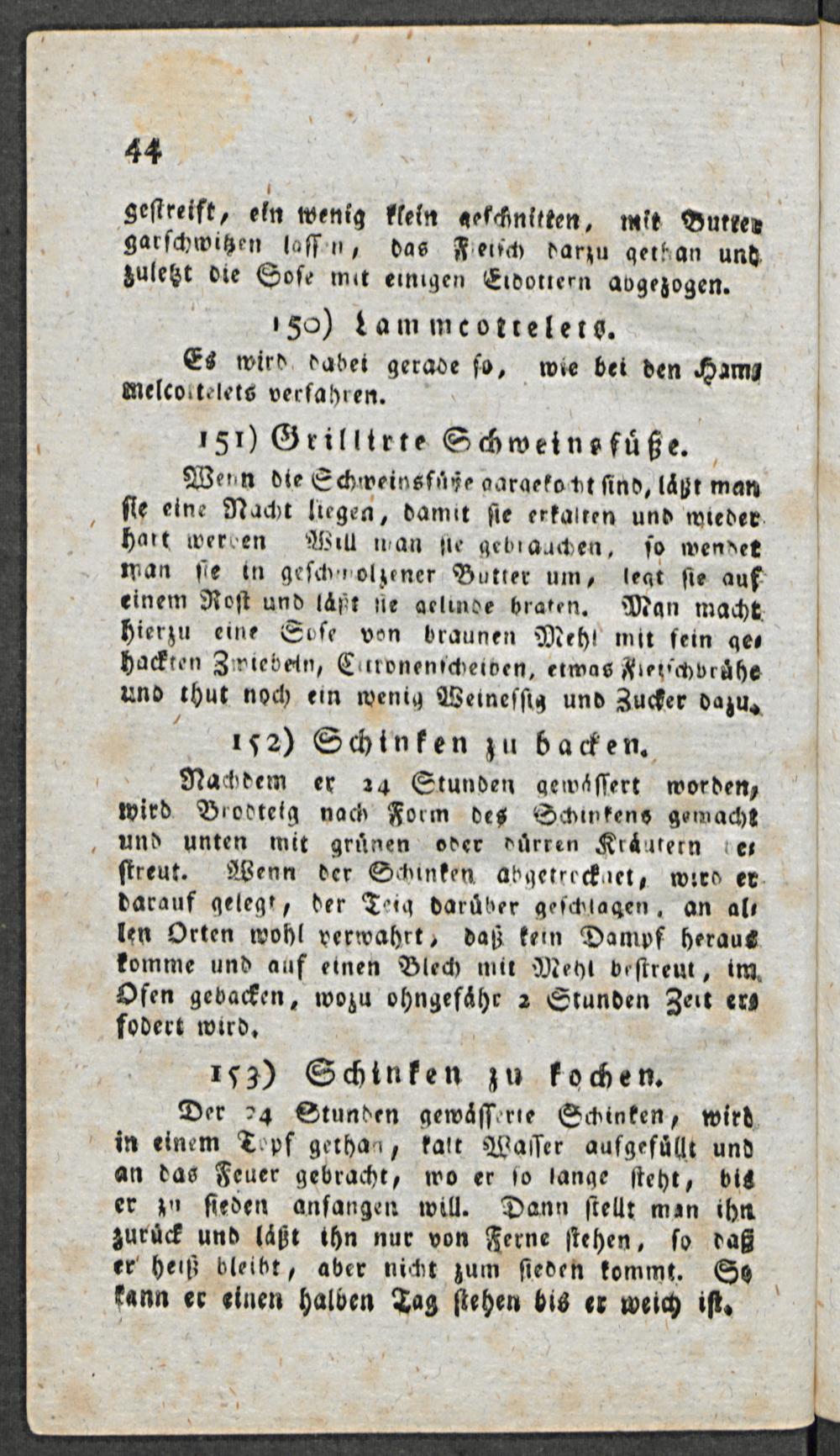 Wenn die Schweinsfüße aargekoctt ſind, laͤht man ſie eine Nacht liegen, damit ſie erkalten und wieder hart werden Will wan ſie gebrauchen, ſo wendet man ſie in geſchmolzener Butter um, legt ſie auf einem Roſt und läßt ſie aelinde braten. Man macht hierzu eine Soſe von braunen Mehl mit fein ge⸗ hackten Zwiebein, Curvnenſcheiben, etwas Feiſchvruͤhe und thut noch ein wenig Weineſſis und Zucher dazu.