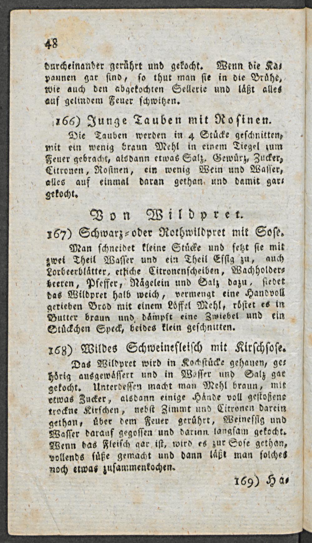 168) Wildes Schweinefleiſch mit Kirſchſoſe. Das Wildpret wird in Kochſtuͤcke gehauen, ge: hoͤrig ausgewoͤſſert und in Waſſer und Salz gar gekocht. Unterdeſſen macht man Mehl braun, mit etwas Zucker, alsdann einige Haͤnde voll geſtoßene trockne Kirſchen, nebſt Zimmt und Citronen darein gethan, uͤber dem Feuer geruͤhrt, Weineſſig und Waſſer darauf gegoſſen und darinn langſam gekocht. Wenn das Fleiſch gar iſt, wird es zur Soſe gethan, vollends ſuͤße gemacht und dann laͤßt man ſolches noch etwas zuſammenkochen. 169) Ha⸗