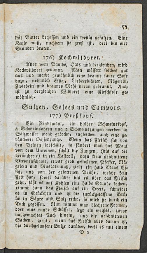 geraͤucherte) in ein Kaſtroll, dazu klein geſchnittene Citronenſchaale, etwas grob geſtoßenen Pfeffer, Naͤn gelein und Muscatennuß, gießt ein halb Maas Eſ⸗ ſig, und von der geſottenen Bruͤhe, welche kein Fett hat, ſoviel daruͤber bis es uͤber das Fleiſch geht, laͤßt es auf Kohlen eine halbe Stunde kochen, immt dann das Fleiſch auf ein Brett, ſchneidet es in Stuͤckchen und iſt die zuruͤckgelaſſene Bruͤ⸗ he in Saͤure und Salz recht, ſo wird ſie durch ein Tuch gegoſſen. Nun nimmt man blecherne Formen, oder eine runde Schuͤſſel, legt ein weißes, zuvor naßgemachtes Tuch hinein, und die geſchnittenen Sachen, gießt, wenn das Fleiſch alles darinn iſt, die durchgelaufene Sulze daruͤber, deckt es mit einem 2 1