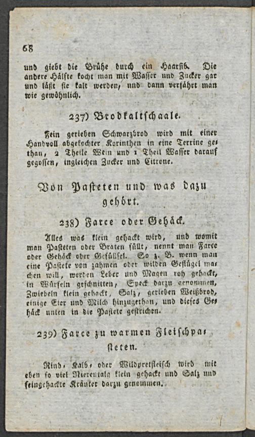 239) Farce zu warmen Fleiſchpa⸗ ſteten. Rind, Kalb, oder Wildpretfleiſch wird mit