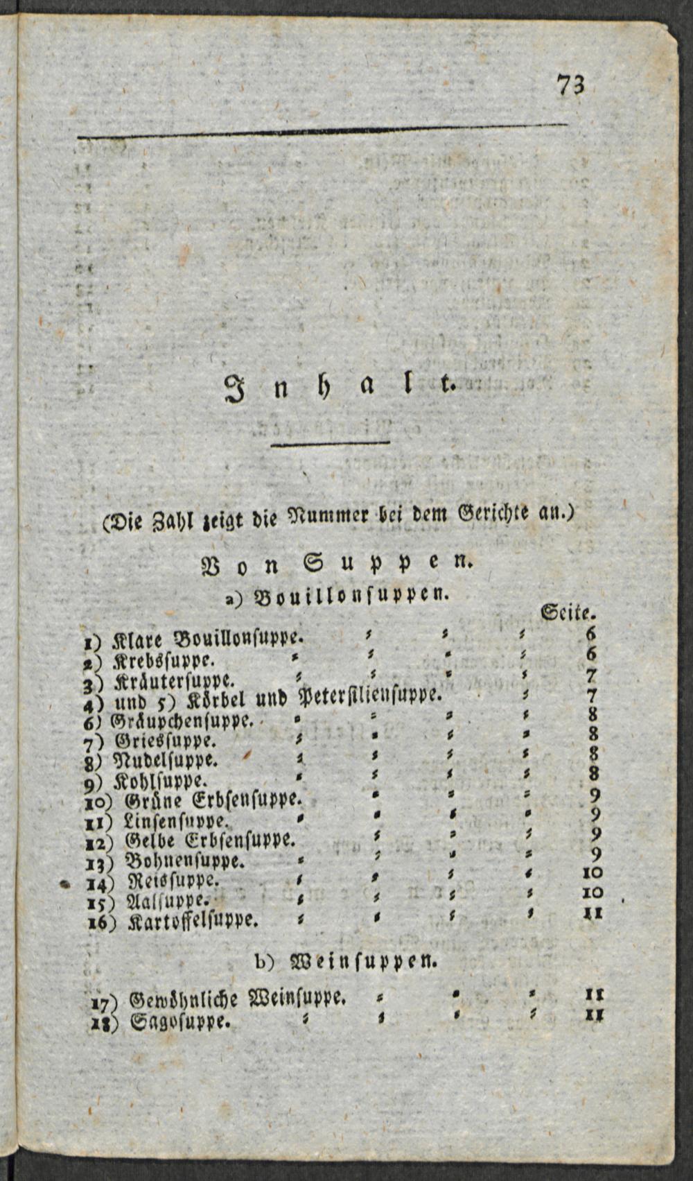 3 Kr ͤuterſuppe⸗ 2 4 ⸗ 3 7 4) und 5) Köͤrbel und Peterſilienſuppe. 7 6) Graͤupchenſuppe. ⸗.. 8 7) Griesſuppe.. ⸗ 1 ⸗ 3 8) Nudelſuppe. 4. 3 8 9) Kohlſuppe. ⸗. 3 2 8 29) Gruͤne Erbſenſuppe.. ². 9 11 Lirſerſapde. 7 7 5. 9 12) Gelbe Erbſenſuppe.*. 3 9 13) Bohnenſuppe. 3. ⸗ 9 . 14) Reisſuppe. 2 4 10 15) Aalſuppe. ⸗ 16. 10