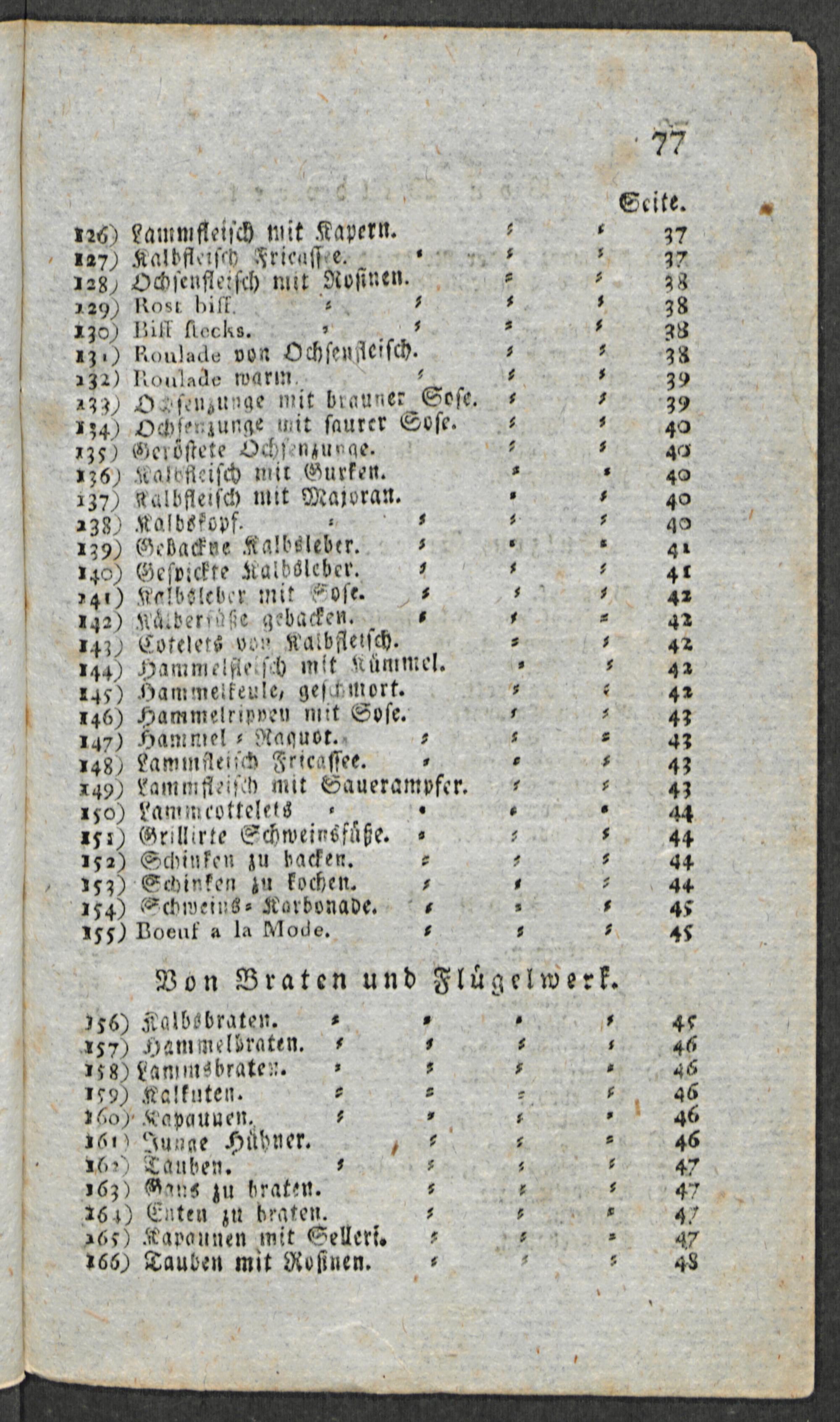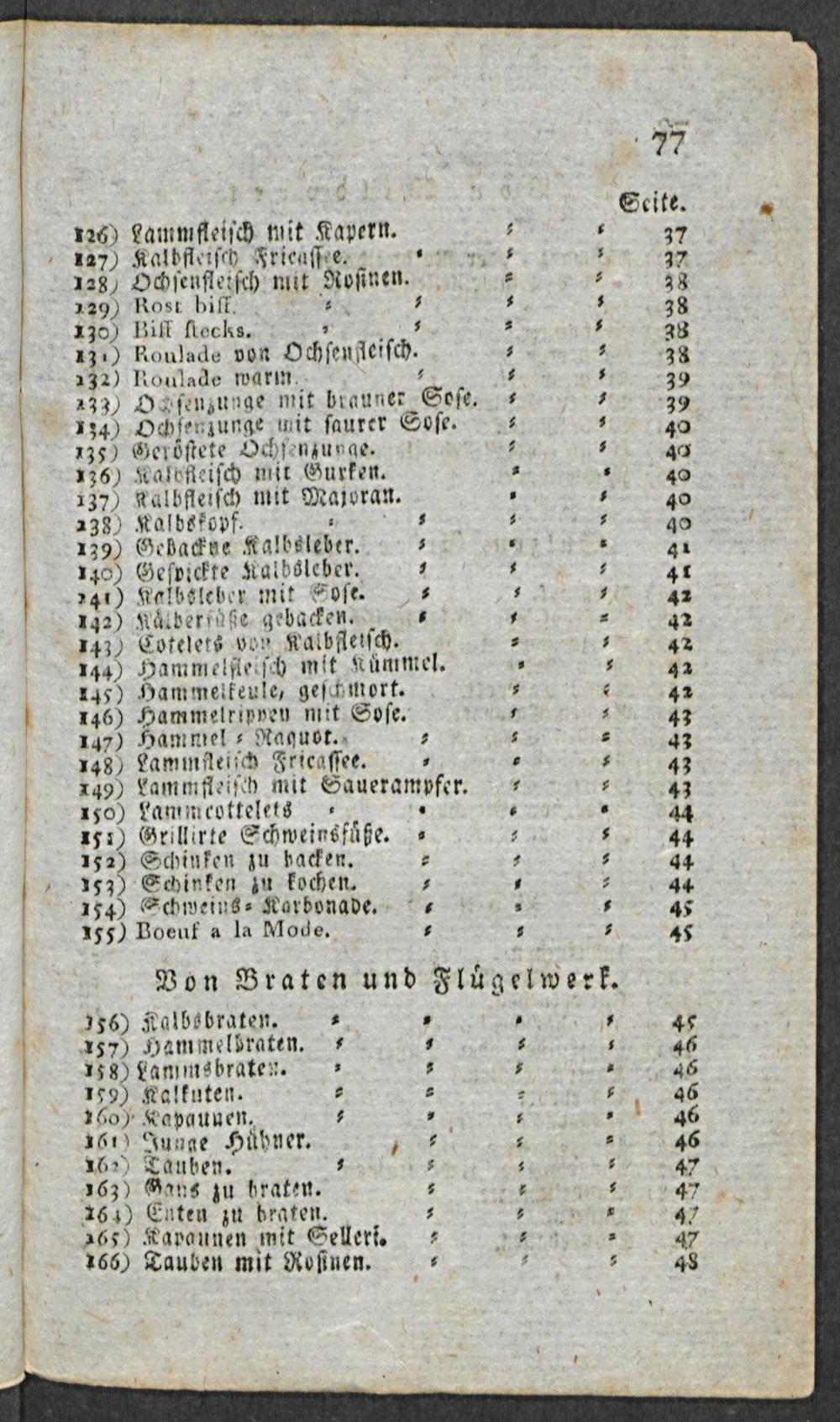 27 Seite.„. 126) Lammfleiſch mit Kapern. 4 3 127) Kalbfleiſch Frieaſſee. ¹ 5, 37 128) Ochſenfleiſch mit Roſinen. ⸗ 3 33 229) Rost biff. 7 7 3 38 130) Biff ftecks. 1 2 7 38 13¹) Roulade von Ochſenſleiſch. 2 7 38 232) Roulade warm. 1 4 3 39 133) Ochſenzunge mit brauner Soſe. ⸗ 3 39 134) Ochſenzunge mit ſaurer Soſe. 3 3 40 135) Geröſtete Ochſenzunge. 3 ⸗ 40 136) Kalbfleiſch mit Gurken.* ⸗ 40 137) Kalbfleiſch mit Majoran.. 1 40 238) Kalbsfopf. ¹ ⸗ 40 ¹ 139) Gehackne Kalbsleber. ⸗— 4 41 140) Geſpickte Kalbsleber. 1 1 3 41 741) Kalbsleber mit Goſe. ⸗ ¹ ⸗ 42 142) Kaͤlberfäße gebacken. ⸗ 42 143) Cotelets von Kalbſleiſch.. 4² 144) Hammelfleiſch mit Kuͤmmel. ⸗ 3 42 145) Hammeikeule, geſchmort.* 6 4² 146) Hammelrippen mit Soſe. ⸗ 43 147) Hammel⸗Raquot. 2 4 2 43 148) Lammfleiſch Fricaſſee.—.. 43 149) Lammfleiſch mit Sauerampfer. 1 ⸗ 43 150) Lammeottelets ⸗.. 44 15¹) Grillirte Schweinsfuͤße. ⸗. 44 152) Schinfen zu backen. 2 3 2 44 153) Schinken zu kochen. ⸗ 3 44 154) Schweins⸗Karbonade.* ⸗ 45 155) Boeuf a la Mode. ⸗ ⸗ ⸗ 45 Von Braten und Fluͤgelwerk.