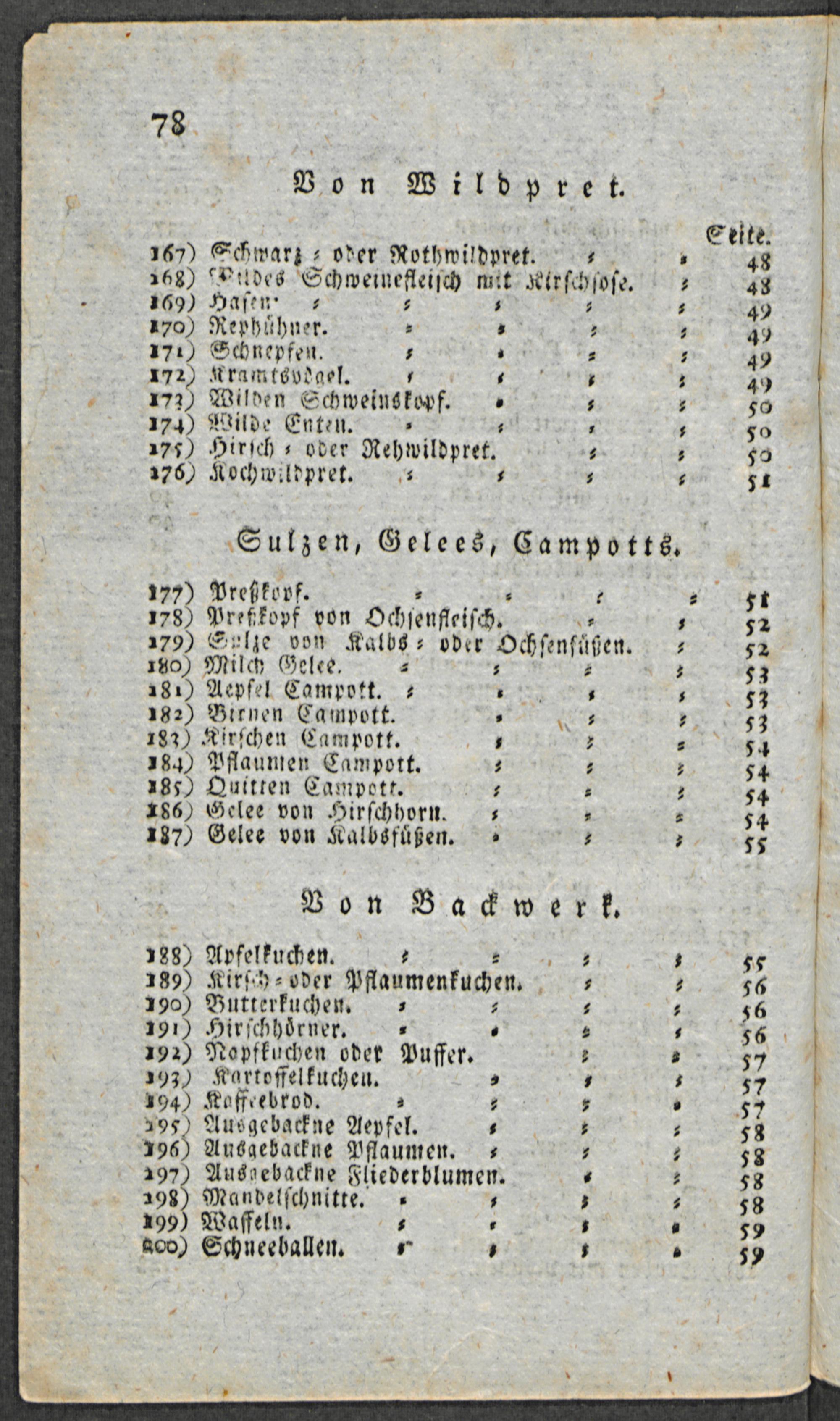 188) Apfelkuchen... 189) Kirſch⸗oder Pſtaumenkuchen.. 190) Butterkuchen.„. 191) Hirſchhoͤrner. ⸗. 19²) Nopfkuchen oder Puffer. 193) Kartoffelkuchen. ² 194) Kaffeebrod. ¹. 295) Ausgebackne Aepfel. 1 196) Ausgebackne Pflaumen. ⸗ 497) Ausgebackne Fliederblumen. 192) Mandelſchnitte. ⸗ 199) Waffeln. ⸗. 800) Schneeballen. 2 ¹