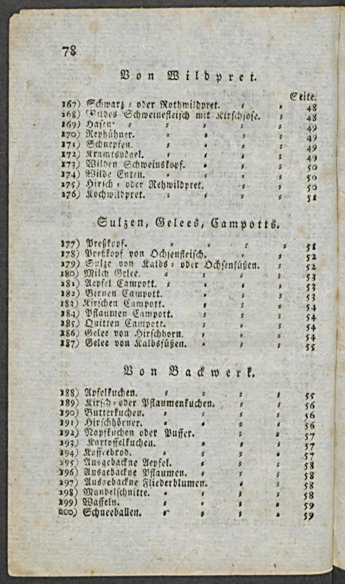 18) Kirſchen Campott. 184) Pflaumen Campott. 185) Quitten Campott. 186) Gelee von Hirſchhorn. 187) Gelee von Kalbsfuͤßen.