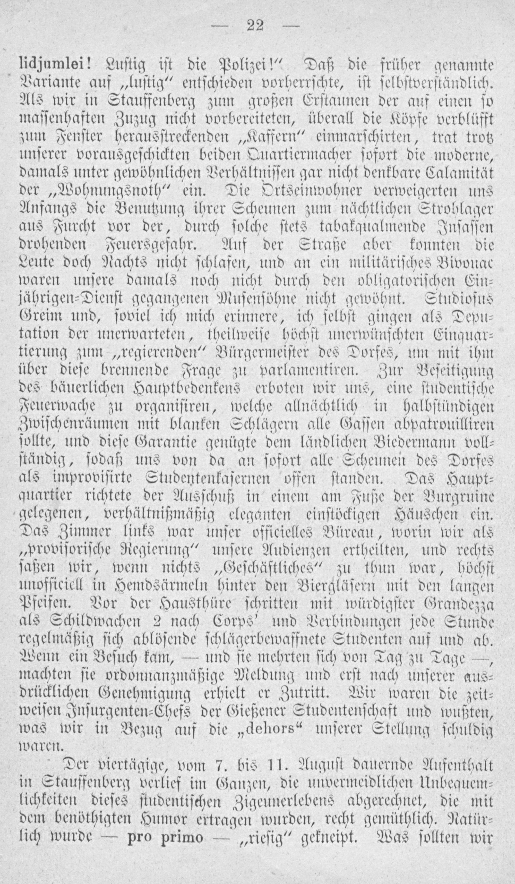 lidjumlei! Luſtig iſt die Polizei!“ Daß die früher genannte Variante auf„luſtig“ entſchieden vorherrſchte, iſt ſelbſtverſtändlich. Als wir in Stauffenberg zum großen Erſtaunen der auf einen ſo maſſenhaften Zuzug nicht vorbereiteten, überall die Köpfe verblüfft zum Fenſter herausſtreckenden„Kaffern“ einmarſchirten, trat trotz unſerer vorausgeſchickten beiden Quartiermacher ſofort die moderne, damals unter gewöhnlichen Verhältniſſen gar nicht denkbare Calamität der„Wohnungsnoth“ ein. Die Ortseinwohner verweigerten uns Anfangs die Benutzung ihrer Scheunen zum nächtlichen Strohlager aus Furcht vor der, durch ſolche ſtets tabakqualmende Inſaſſen drohenden Feuersgeſahr. Auf der Straße aber konnten die Leute doch Nachts nicht ſchlafen, und an ein militäriſches Bivonac waren unſere damals noch nicht durch den obligatoriſchen Ein⸗ jährigen⸗Dienſt gegangenen Muſenſöhne nicht gewöhnt. Studioſus Greim und, ſoviel ich mich erinnere, ich ſelbſt gingen als Depu⸗ tation der unerwarteten, theilweiſe höchſt unerwünſchten Einquar⸗ tierung zum„regierenden“ Bürgermeiſter des Dorfes, um mit ihm über dieſe brennende Frage zu parlamentiren. Zur Beſeitigung des bäuerlichen Hauptbedenkens erboten wir uns, eine ſtudentiſche Feuerwache zu organiſiren, welche allnächtlich in halbſtündigen Zwiſchenräumen mit blanken Schlägern alle Gaſſen abpatrouilliren ſollte, und dieſe Garantie genügte dem ländlichen Biedermann voll⸗ ſtändig, ſodaß uns von da an ſofort alle Scheunen des Dorfes als improviſirte Studentenkaſernen offen ſtanden. Das Haupt⸗ quartier richtete der Ausſchuß in einem am Fuße der Burgruine gelegenen, verhältnißmäßig eleganten einſtöckigen Häuschen ein. Das Zimmer links war unſer officielles Büreau, worin wir als „proviſoriſche Regierung“ unſere Audienzen ertheilten, und rechts ſaßen wir, wenn nichts„Geſchäſtliches“ zu thun war, höchſt unofſiciell in Hemdsärmeln hinter den Biergläſern mit den langen Pfeifen. Vor der Hausthüre ſchritten mit würdigſter Grandezza als Schildwachen 2 nach Corps' und Verbindungen jede Stunde regelmäßig ſich ablöſende ſchlägerbewaffnete Studenten auf und ab. Wenn ein Beſuch kam,— und ſie mehrten ſich von Tag zu Tage—, machten ſie ordonnanzmäßige Meldung und erſt nach unſerer aus⸗ drücklichen Genehmigung erhielt er Zutritt. Wir waren die zeit⸗ weiſen Inſurgenten⸗Chefs der Gießener Studentenſchaft und wußten, was wir in Bezug auf die„dehors“ unſerer Stellung ſchuldig waren.