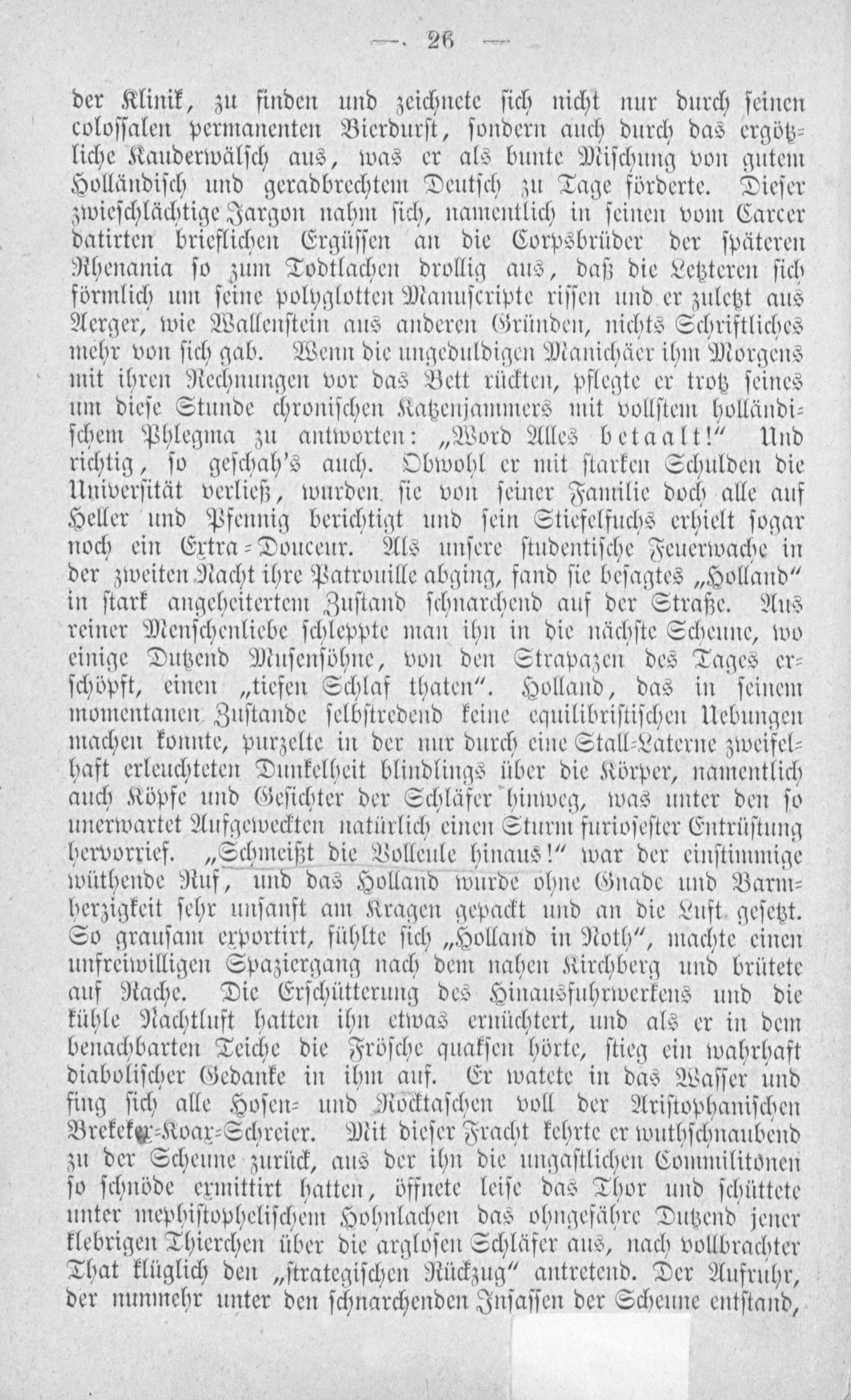 der Klinik, zu finden und zeichnete ſich nicht nur durch ſeinen coloſſalen permanenten Bierdurſt, ſondern auch durch das ergötz⸗ liche Kauderwälſch aus, was er als bunte Miſchung von gutem Holländiſch und geradbrechtem Deutſch zu Tage förderte. Dieſer zwieſchlächtige Jargon nahm ſich, namentlich in ſeinen vom Carcer datirten brieflichen Ergüſſen an die Corpsbrüder der ſpäteren Rhenania ſo zum Todtlachen drollig aus, daß die Letzteren ſich förmlich um ſeine polyglotten Manuſcripte riſſen und er zuletzt aus Aerger, wie Wallenſtein aus anderen Gründen, nichts Schriftliches mehr von ſich gab. Wenn die ungeduldigen Manichäer ihm Morgens mit ihren Rechnungen vor das Bett rückten, pflegte er trotz ſeines um dieſe Stunde chroniſchen Katzenjammers mit vollſtem holländi⸗ ſchem Phlegma zu antworten:„Word Alles betaalt!“ Und richtig, ſo geſchah's auch. Obwohl er mit ſtarken Schulden die Univerſität verließ, wurden ſie von ſeiner Familie doch alle auf Heller und Pfennig berichtigt und ſein Stiefelfuchs erhielt ſogar noch ein Ertra⸗Douceur. Als unſere ſtudentiſche Feuerwache in der zweiten Nacht ihre Patrouille abging, fand ſie beſagtes„Holland“ in ſtark angeheitertem Zuſtand ſchnarchend auf der Straße. Aus reiner Menſchenliebe ſchleppte man ihn in die nächſte Scheune, wo einige Dutzend Muſenſöhne, von den Strapazen des Tages er⸗ ſchöpft, einen„tiefen Schlaf thaten“. Holland, das in ſeinem momentanen Zuſtande ſelbſtredend keine equilibriſtiſchen Uebungen machen konnte, purzelte in der nur durch eine Stall⸗Laterne zweifel⸗ haft erleuchteten Dunkelheit blindlings über die Körper, namentlich auch Köpfe und Geſichter der Schläfer hinweg, was unter den ſo unerwartet Aufgeweckten natürlich einen Sturm furioſeſter Entrüſtung hervorrief.„Schmeißt die Volleule hinaus!“ war der einſtimmige wüthende Ruf, und das Holland wurde ohne Gnade und Barm⸗ herzigkeit ſehr unſanft am Kragen gepackt und an die Luft geſetzt. So grauſam erportirt, fühlte ſich„Holland in Noth“, machte einen unfreiwilligen Spaziergang nach dem nahen Kirchberg und brütete auf Rache. Die Erſchütterung des Hinausfuhrwerkens und die kühle Nachtluft hatten ihn etwas ernüchtert, und als er in dem benachbarten Teiche die Fröſche quakſen hörte, ſtieg ein wahrhaft diaboliſcher Gedanke in ihm auf. Er watete in das Waſſer und fing ſich alle Hoſen⸗ und Rocktaſchen voll der Ariſtophaniſchen Brekeker⸗Koax⸗Schreier. Mit dieſer Fracht kehrte er wuthſchnaubend zu der Scheune zurück, aus der ihn die ungaſtlichen Commilitonen ſo ſchnöde ermittirt hatten, öffnete leiſe das Thor und ſchüttete unter mephiſtopheliſchem Hohnlachen das ohngefähre Dutzend jener klebrigen Thierchen über die argloſen Schläfer aus, nach vollbrachter That klüglich den„ſtrategiſchen Rückzug“ antretend. Der Aufruhr, der nunmehr unter den ſchnarchenden Inſaſſen der Scheune entſtand,