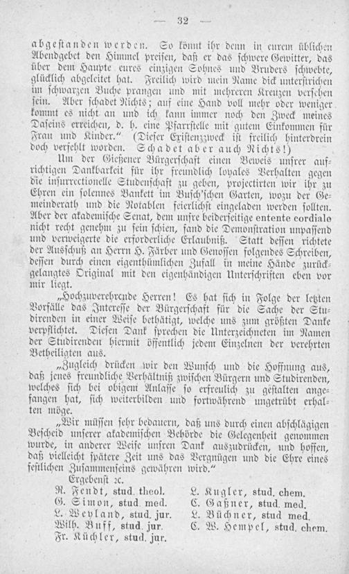 Um der Gießener Bürgerſchaft einen Beweis unſrer auf⸗ richtigen Dankbarkeit für ihr freundlich loyales Verhalten gegen die inſurrectionelle Studenſchaft zu geben, projectirten wir ihr zu Ehren ein ſolennes Bankett im Buſch'ſchen Garten, wozu der Ge⸗ meinderath und die Notablen feierlichſt eingeladen werden ſollten. Aber der akademiſche Senat, dem unſre beiderſeitige entente cordialo nicht recht genehm zu ſein ſchien, fand die Demonſtration unpaſſend und verweigerte die erforderliche Erlaubniß. Statt deſſen richtete der Ausſchuß an Herrn H. Färber und Genoſſen folgendes Schreiben, deſſen durch einen eigenthümlichen Zufall in meine Hände zurück⸗ gelangtes Original mit den eigenhändigen Unterſchriften eben vor mir liegt.
