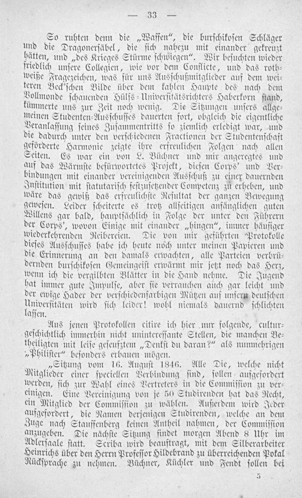 „Sitzung vom 16. Auguſt 1846. Alle Die, welche nicht Mitglieder einer ſpeciellen Verbindung ſind, ſollen aufgefordert werden, ſich zur Wahl eines Vertreters in die Commiſſion zu ver⸗ einigen. Eine Vereinigung von je 50 Studirenden hat das Recht, ein Mitglied der Commiſſion zu wählen. Außerdem wird Jeder aufgefordert, die Namen derjenigen Studirenden, welche an dem Zuge nach Stauffenberg keinen Antheil nahmen, der Commiſſion anzugeben. Die nächſte Sitzung findet morgen Abend 8 Uhr im Adlerſaale ſtatt. Scriba wird beauftragt, mit dem Silberarbeiter Heinrichs über den Herrn Profeſſor Hildebrand zu überreichenden Pokal Rückſprache zu nehmen. Büchner, Küchler und Fendt ſollen bei