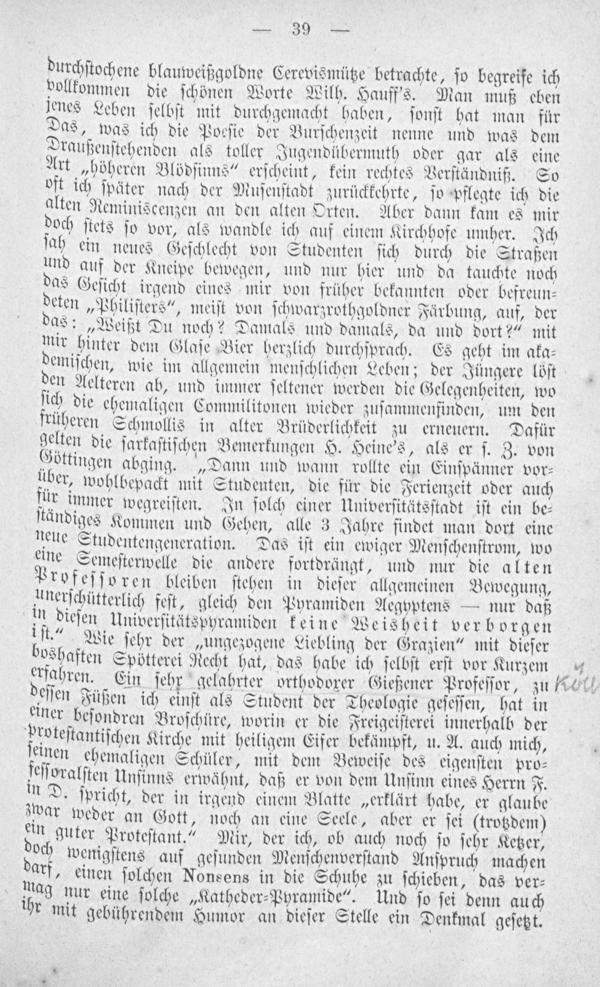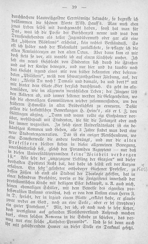 durchſtochene blauweißgoldne Cerevismütze betrachte, ſo begreife ich vollkommen die ſchönen Worte Wilh. Hauff's. Man muß eben jenes Leben ſelbſt mit durchgemacht haben, ſonſt hat man für Das, was ich die Poeſie der Burſchenzeit nenne und was dem Draußenſtehenden als toller Jugendübermuth oder gar als eine Art„höheren Blödſinns“ erſcheint, kein rechtes Verſtändniß. So oft ich ſpäter nach der Muſenſtadt zurückkehrte, ſo pflegte ich die alten Reminiscenzen an den alten Orten. Aber dann kam es mir doch ſtets ſo vor, als wandle ich auf einem Kirchhofe umher. Ich ſah ein neues Geſchlecht von Studenten ſich durch die Straßen und auf der Kneipe bewegen, und nur hier und da tauchte noch das Geſicht irgend eines mir von früher bekannten oder befreun⸗ deten„Philiſters“, meiſt von ſchwarzrothgoldner Färbung, auf, der as:„Weißt Du noch? Damals und damals, da und dort?“ mit mir hinter dem Glaſe Bier herzlich durchſprach. Es geht im aka⸗ demiſchen, wie im allgemein menſchlichen Leben; der Jüngere löſt den Aelteren ab, und immer ſeltener werden die Gelegenheiten, wo ſich die ehemaligen Commilitonen wieder zuſammenfinden, um den rüheren Schmollis in alter Brüderlichkeit zu erneuern. Dafür gelten die ſarkaſtiſchen Bemerkungen H. Heine's, als er ſ. Z. von Göttingen abging.„Dann und wann rollte ein Einſpänner vor⸗ über, wohlbepackt mit Studenten, die für die Ferienzeit oder auch für immer wegreiſten. In ſolch einer Univerſitätsſtadt iſt ein be⸗ ſtändiges Kommen und Gehen, alle 3 Jahre findet man dort eine neue Studentengeneration. Das iſt ein ewiger Menſchenſtrom, wo eine Semeſterwelle die andere fortdrängt, und nur die alten Profeſſoren bleiben ſtehen in dieſer allgemeinen Bewegung, unerſchütterlich feſt, gleich den Pyramiden Aegyptens— nur daß in dieſen Univerſitätspyramiden keine Weisheit verb orgen iſt.“ Wie ſehr der„ungezogene Liebling der Grazien“ mit dieſer boshaften Spötterei Recht hat, das habe ich ſelbſt erſt vor Kurzem 4 4 erfahren. Ein ſehr gelabhrter orthodoxer Gießener Profeſſor, zu oln deſſen Füßen ich einſt als Student der Theologie geſeſſen, hat in einer beſondren Broſchüre, worin er die Freigeiſterei innerhalb der proteſtantiſchen Kirche mit heiligem Eifer bekämpft, u. A. auch mich, einen ehemaligen Schüler, mit dem Beweiſe des eigenſten pro⸗ feſſoralſten Unſinns erwähnt, daß er von dem Unſinn eines Herrn F. in D. ſpricht, der in irgend einem Blatte„erklärt habe, er glaube zwar weder an Gott, noch an eine Seele, aber er ſei(trotzdem) ein guter Proteſtant.“ Mir, der ich, ob auch noch ſo ſehr Ketzer, och wenigſtens auf geſunden Menſchenverſtand Anſpruch machen arf, einen ſolchen Nonsens in die Schuhe zu ſchieben, das ver⸗ mag nur eine ſolche„Katheder⸗Pyramide“. Und ſo ſei denn auch ihr mit gebührendem Humor an dieſer Stelle ein Denkmal geſetzt.